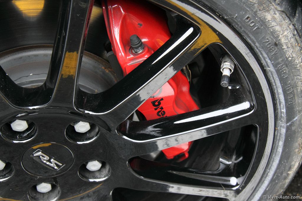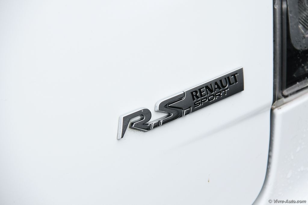 Esthétiquement, elle se distingue sans problème d’une R.S. classique. Ce qui saute tout de suite aux yeux, c’est le stripping latéral sur les côtés de la caisse et le damier en bas des portes en gris platine. Certain trouveront peut-être cela un peu trop voyant, d’autant qu’en regardant de plus prêt ces autocollants manquent un peu de finesse, sachez qu’ils peuvent être enlevés. D’autres éléments sont exclusifs à l’instar d’une lame type F1 à l’avant, de seuil de portes numérotés et de jantes 19 pouces « Speedline Turini » noire (en option) dérivées des Mégane de compétition. Enfin, le détail qui nous a particulièrement plus, la ligne d’échappement en titane Akrapovic.