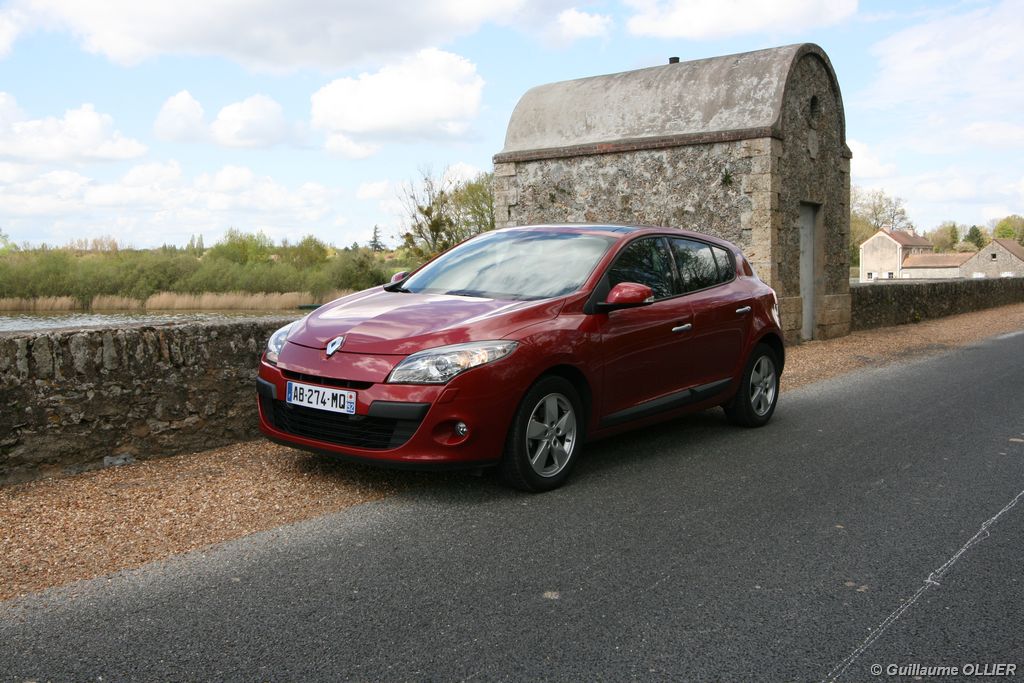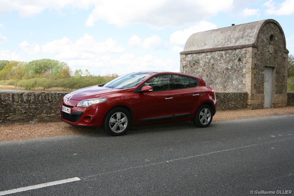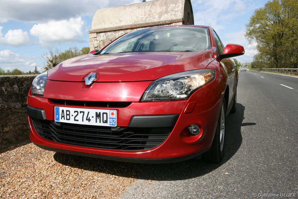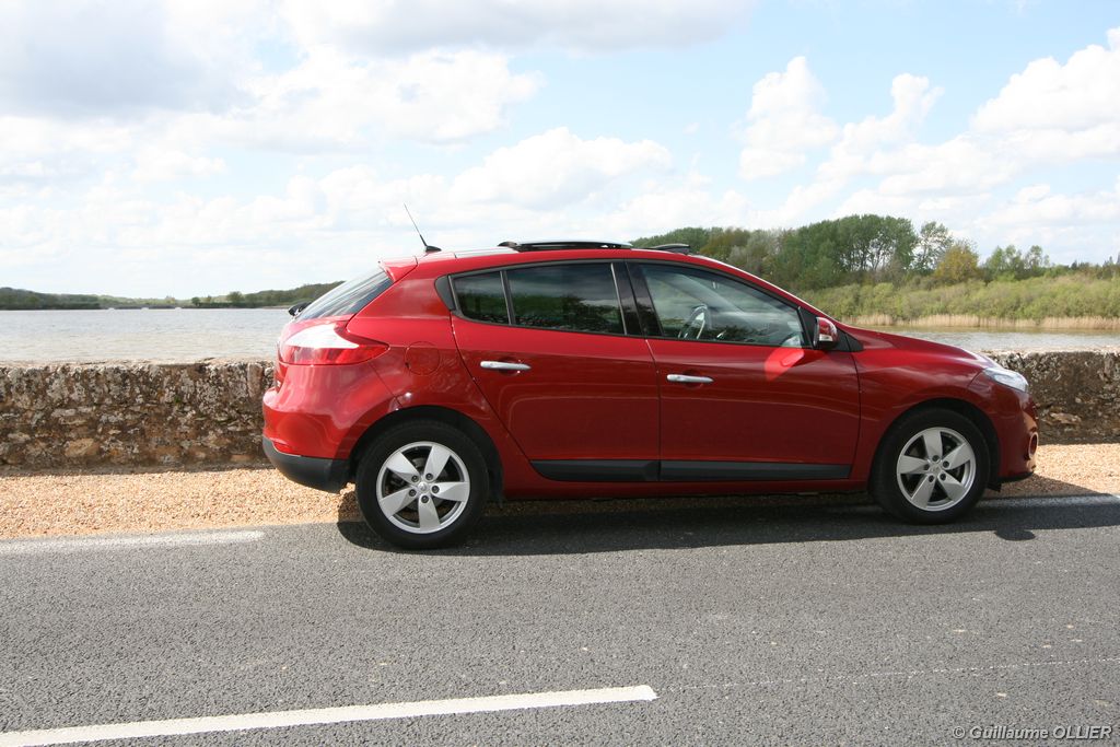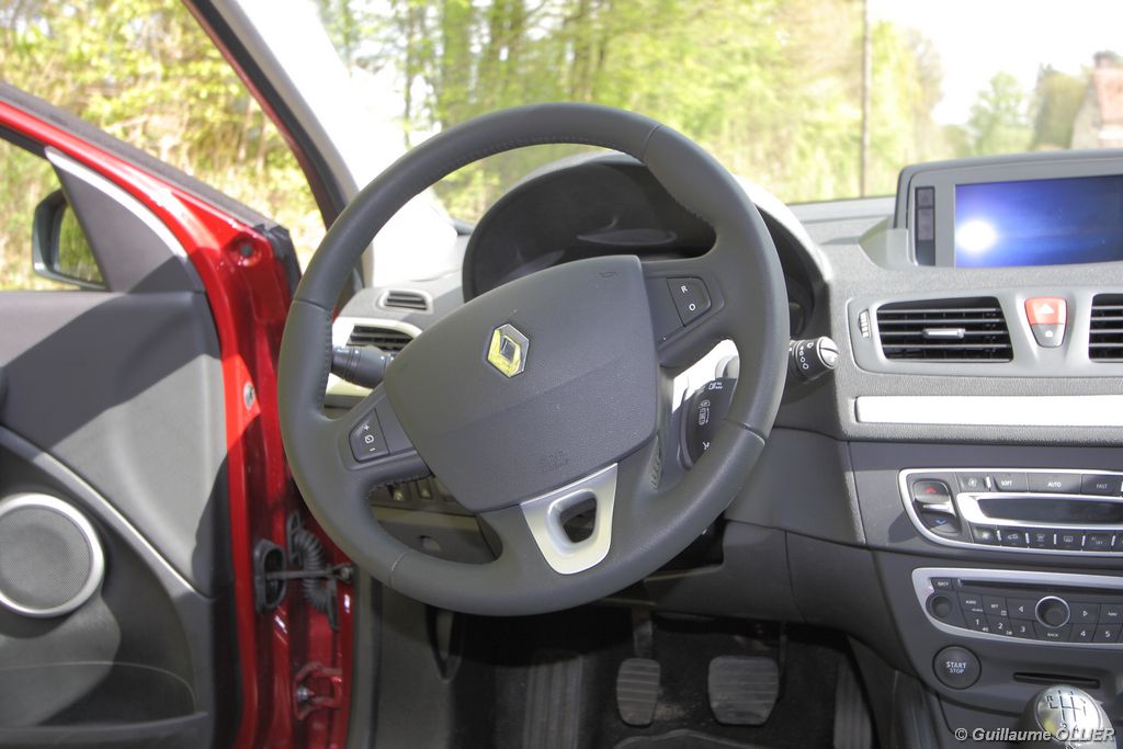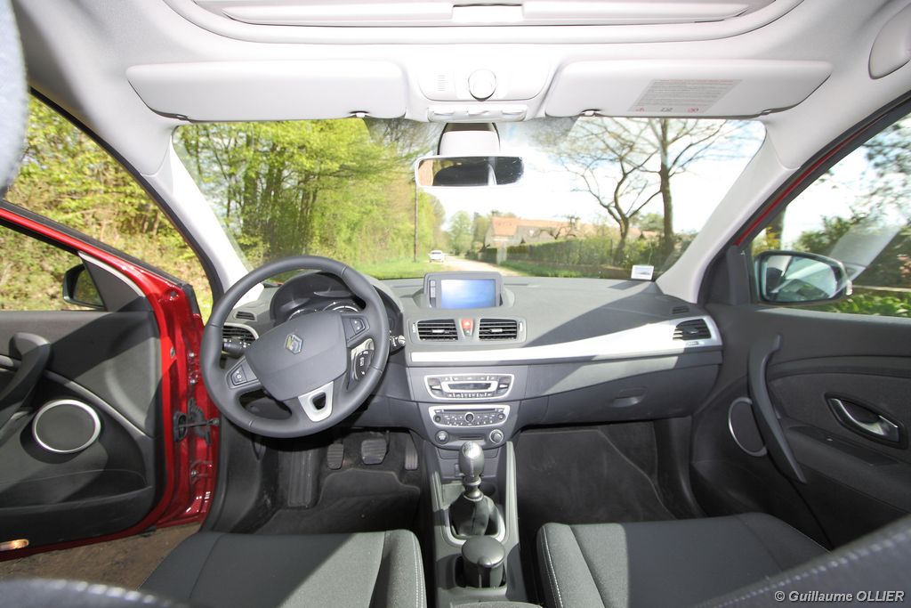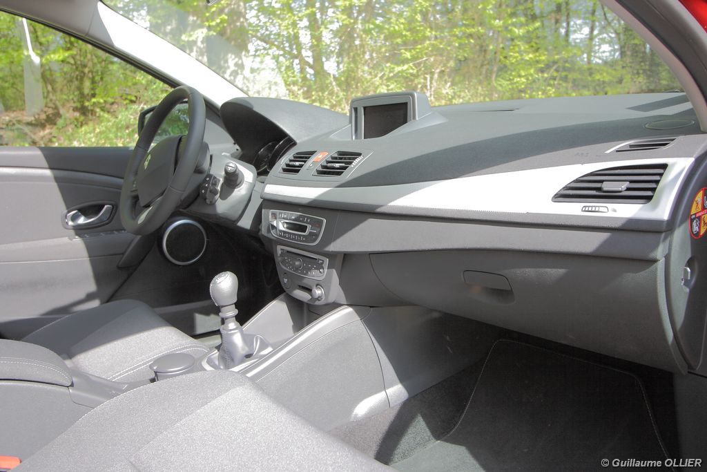 L’intérieur parait moderne, avec une planche de bord épurée et élégante. La finition est soignée, et la partie haute en plastique moussé noir offre un bel aspect. L’habitacle est lumineux grâce notamment au toit ouvrant. Les compteurs sont très réussis, et offrent une bonne visibilité. Un témoin vous indique s’il faut passer un rapport de vitesse supérieur ou au contraire rétrograder. Autre détail, des tranches lumineuses situées au-dessus du compteur de vitesse vous informent en cas de dépassement important de la vitesse programmée via le régulateur/limiteur de vitesse. La carte main libre, tout comme le frein à main électrique sont vraiment un plus sur le plan technologique, et certaines personnes auront du mal à s’en passer. La climatisation bizone est très bien étudiée, avec deux modes « Soft » et « Fast » en fonction de l’exigence du conducteur. La Mégane berline s’avère généreuse en terme d’habitabilité. Ses occupants seront à l’aise à l’avant comme à l’arrière, l’espace aux jambes étant correct et la banquette confortable. Toutefois, certains trouveront que les vitres arrière sont étroites. Le coffre d’une contenance variant de 372 à 1 129 dm3 fait de la compacte du losange une référence. Rien à voir donc avec l’ancien modèle qui offrait à peine 250 dm3. Les rangements sont de rigueur, avec en plus de la boîte à gants, des trappes dans le plancher, un rangement sous l’accoudoir, et bien sûr des bacs de portières.