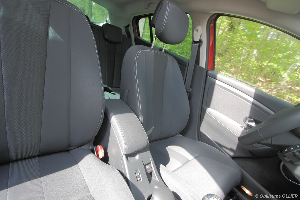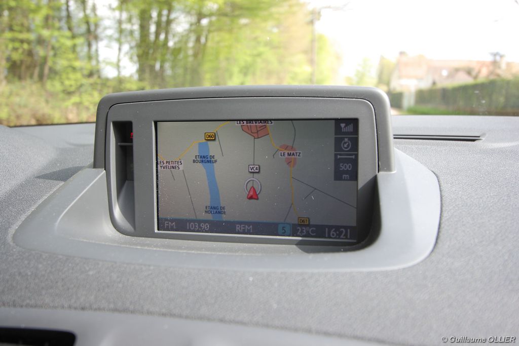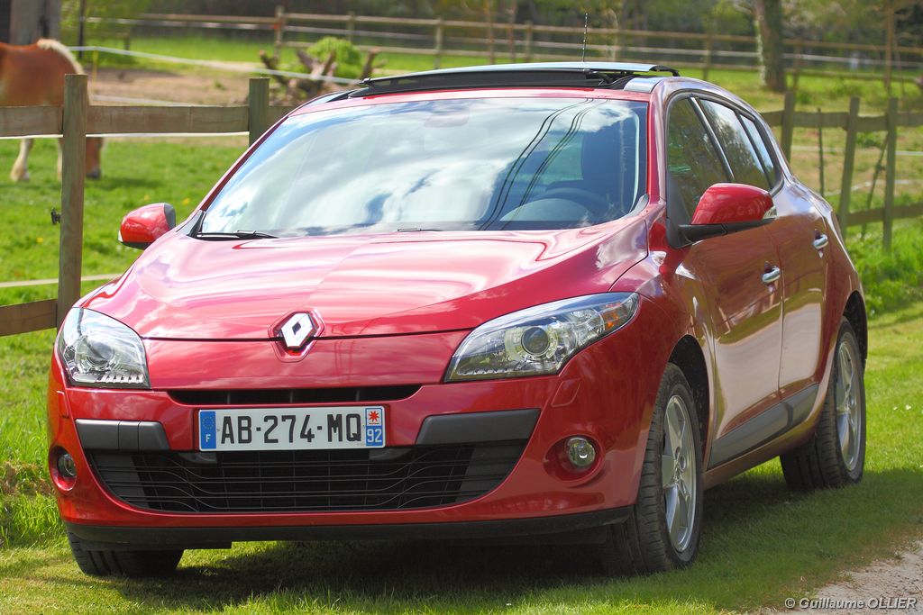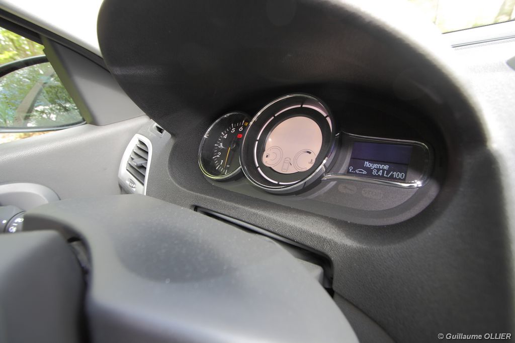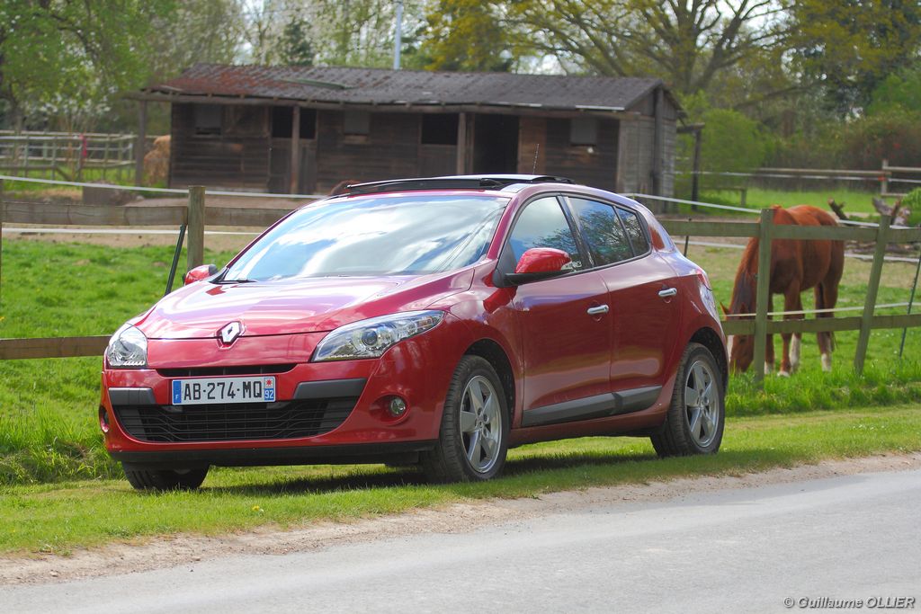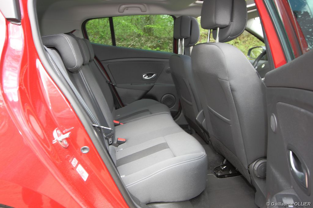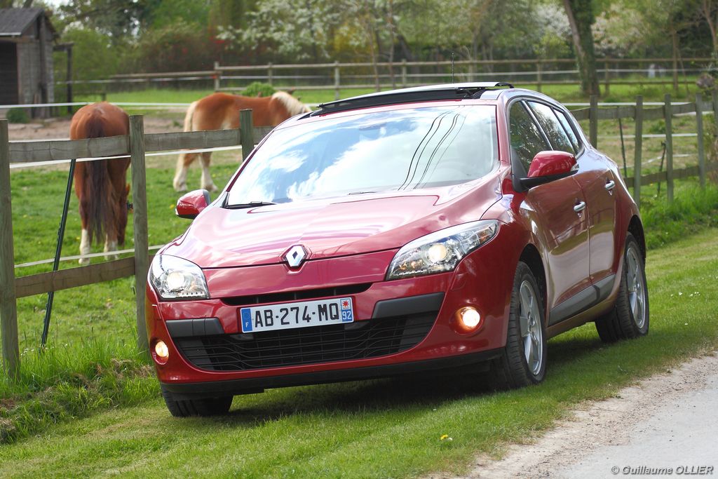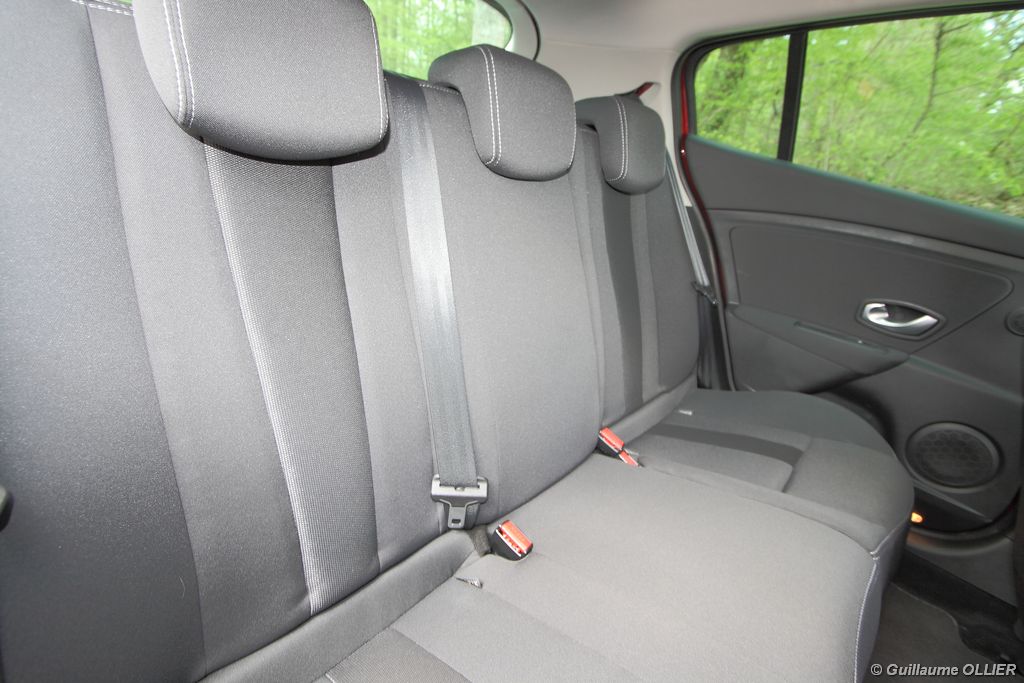 L’intérieur parait moderne, avec une planche de bord épurée et élégante. La finition est soignée, et la partie haute en plastique moussé noir offre un bel aspect. L’habitacle est lumineux grâce notamment au toit ouvrant. Les compteurs sont très réussis, et offrent une bonne visibilité. Un témoin vous indique s’il faut passer un rapport de vitesse supérieur ou au contraire rétrograder. Autre détail, des tranches lumineuses situées au-dessus du compteur de vitesse vous informent en cas de dépassement important de la vitesse programmée via le régulateur/limiteur de vitesse. La carte main libre, tout comme le frein à main électrique sont vraiment un plus sur le plan technologique, et certaines personnes auront du mal à s’en passer. La climatisation bizone est très bien étudiée, avec deux modes « Soft » et « Fast » en fonction de l’exigence du conducteur. La Mégane berline s’avère généreuse en terme d’habitabilité. Ses occupants seront à l’aise à l’avant comme à l’arrière, l’espace aux jambes étant correct et la banquette confortable. Toutefois, certains trouveront que les vitres arrière sont étroites. Le coffre d’une contenance variant de 372 à 1 129 dm3 fait de la compacte du losange une référence. Rien à voir donc avec l’ancien modèle qui offrait à peine 250 dm3. Les rangements sont de rigueur, avec en plus de la boîte à gants, des trappes dans le plancher, un rangement sous l’accoudoir, et bien sûr des bacs de portières.