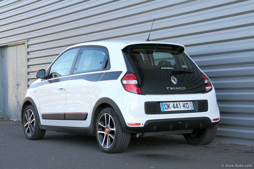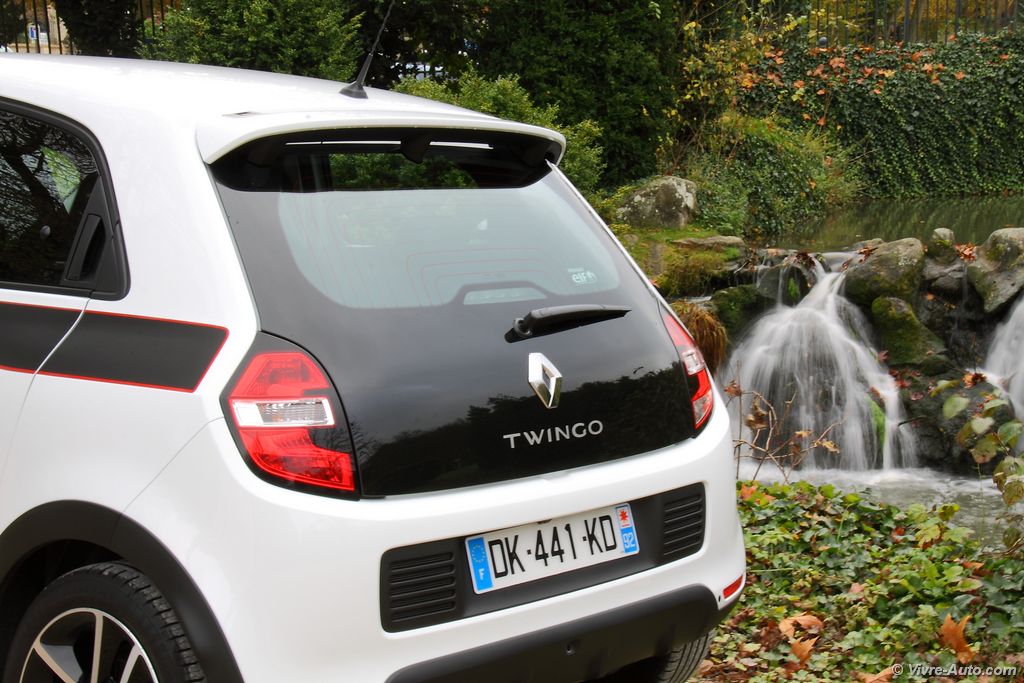 C’est en 1993 que la première génération de Renault Twingo fait son apparition sur nos routes. A cette époqueRenault Twingo 3 - essai sur Vivre Auto elle bouleversait le marché des petites citadines avec sa petite taille et son vaste espace intérieur. Mais quelques années plus tard, en 2007, la deuxième génération a pris le relais avec un style bien plus classique et elle se fondait dans la masse des nombreuses concurrentes… Pour ce troisième épisode, le constructeur français s’est lancé le défi de réinventer la Twingo pour revenir à l’esprit original de la première version. Grâce au partenariat avec Smart, la nouvelle Twingo adopte une architecture à moteur arrière qui laisse place à de nombreux avantages. Mais commençons par son style. Moins longue de 10 cm que sa devancière, la nouvelle Twingo gagne pour autant deux portes supplémentaires pour les passagers arrière. Les poignées sont dissimulées  dans le montant des fenêtres comme sur la Clio. Son design fait référence au passé, Renault Twingo 3 - essai sur Vivre Autonotamment pour la partie arrière qui n’est pas sans nous rappeler une certaine R5. Et c’est plutôt réussi ! Avec sa bouille sympathique elle se montre robuste et dynamique. L’acheteur peut même personnaliser l’extérieur avec trois décors au choix, blanc, bleu ou rouge, présent sur les joncs de calandre, les protections de portes et les rétroviseurs. Ou encore des strippings latéraux (lignes de caisse) de différentes formes qui viennent habiller la carrosserie. Notre version est une série limitée Edition One, elle est dotée de jantes en alliages 16″ diamantées noir, de décor rouge et d’un stripping exclusif. Disponible avec une teinte de carrosserie blanche ou noir, ces différents éléments lui confèrent une petite touche sportive. En dehors de cette version, on retrouve, au catalogue, sept teintes et sept types de jantes de 15″ ou 16″.