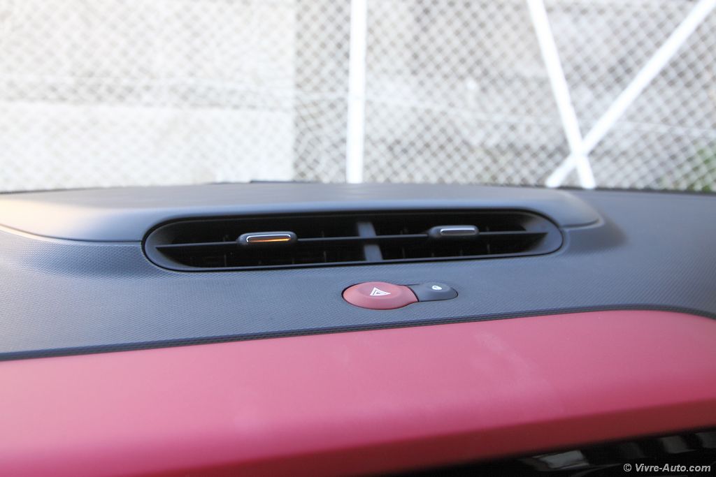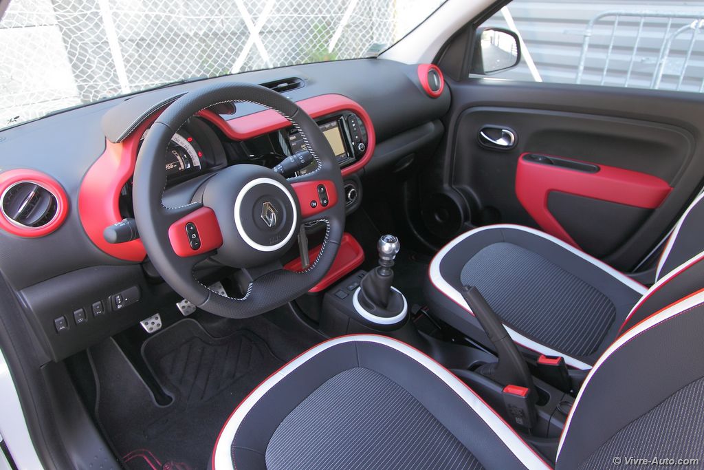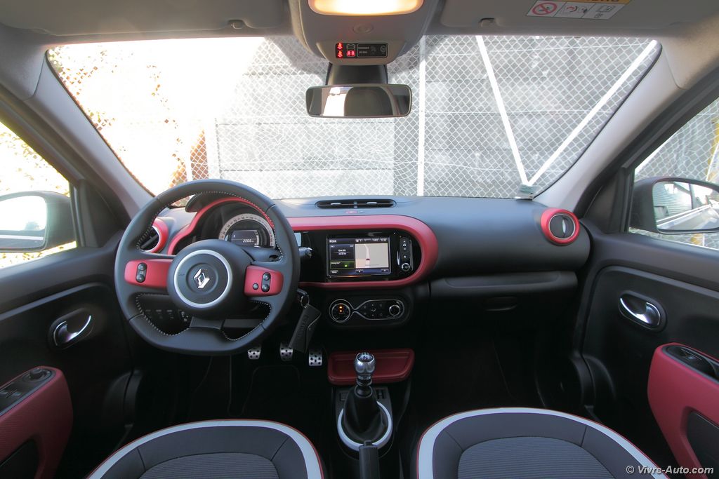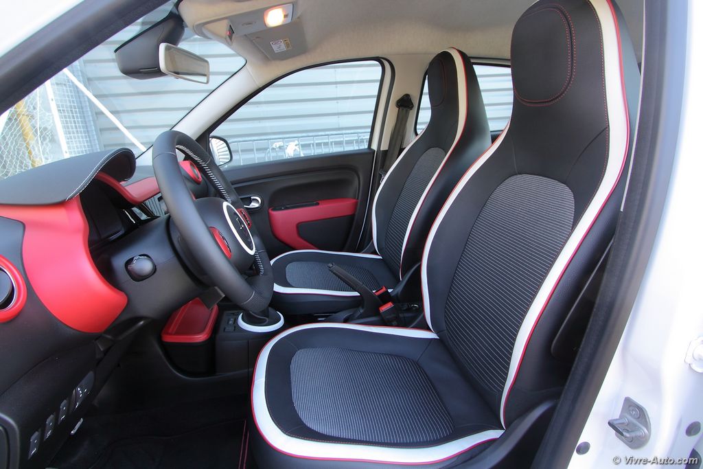 Une fois la porte franchie, on s’aperçoit que l’effort apporté à l’extérieur se ressent également à bord. On estRenault Twingo 3 intérieur - essai sur Vivre Auto ainsi en présence d’un intérieur moderne et original. Mains ça ne s’arrête pas à ça. En effet le partenariat avec Smart a permit d’employer des matériaux de très bonne qualité comme en témoigne les plastiques. Il n’est plus question d’apercevoir le moindre bout de tôle comme c’était le cas auparavant. Comme pour l’extérieur, la personnalisation est également présente dans l’habitacle avec quatre types de décors possibles. Ainsi, les inserts du volant, le bandeau de planche de bord, le cerclage des aérateurs et divers éléments se parent de rouge, bleu, noir ou blanc. C’est aussi le cas pour la sellerie qui dispose de cinq configurations en fonction de votre choix. Les sièges avant avec appuie tête intégré au dessin original se montre relativement confortable. La position de conduite, un peu haute, est excellente et offre une visibilité optimale. On remarque juste que le repose pied est placé un peu trop haut. Pour offrir encore plus de cachet à cet intérieur, Renault propose en option un toit ouvrant en toile (1.000€).