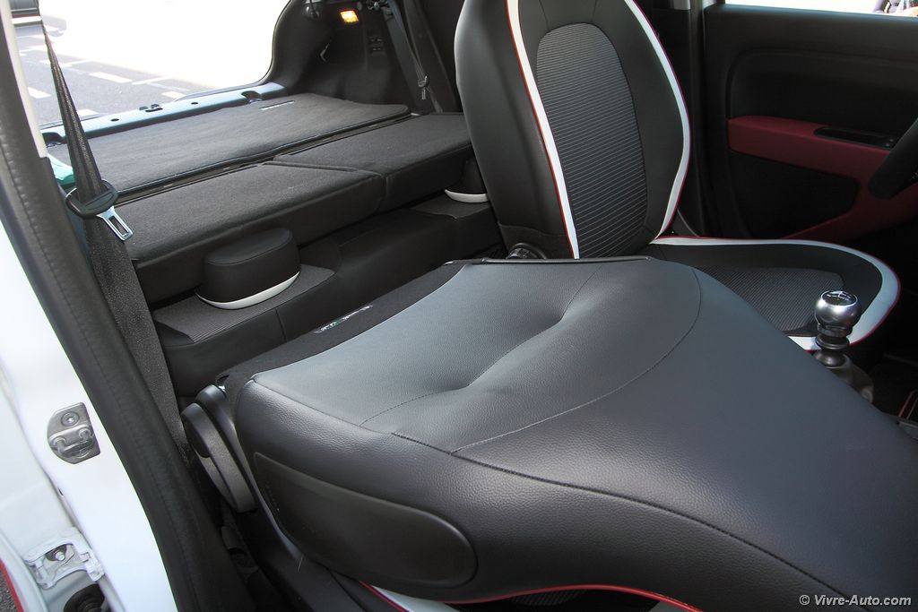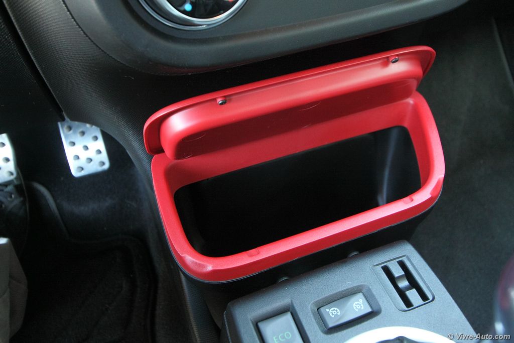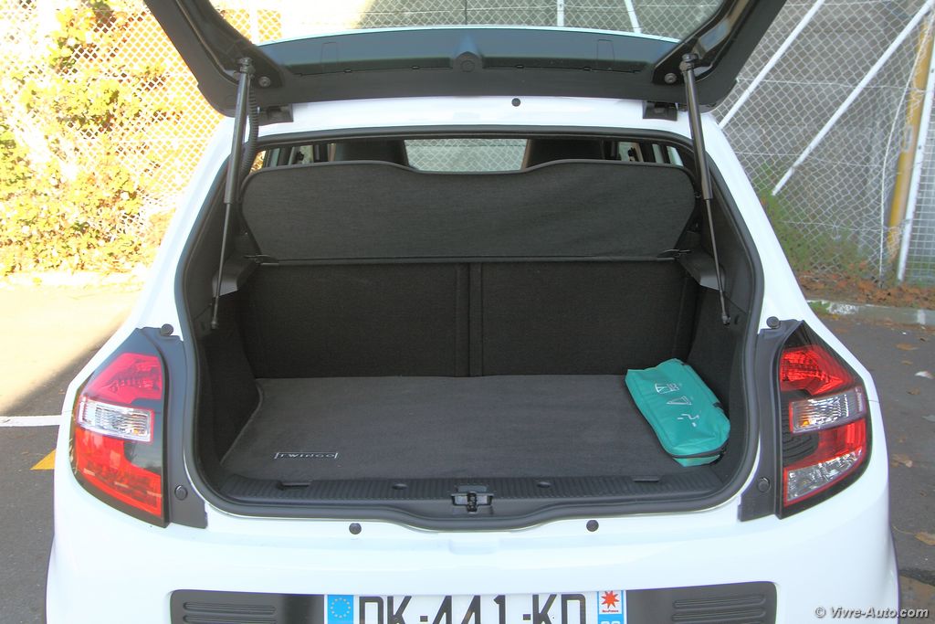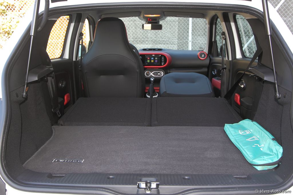Renault Twingo 3 intérieur - essai sur Vivre AutoAvec un empattement de 2,46 mètres, l’espace à bord est plus généreux de 33 cm de long sur le papier par rapport à l’ancienne Twingo. Mais ce n’est pas pour autant que l’habitabilité est plus importante. En raison de la présence du moteur à l’arrière, la fameuse banquette coulissante n’est pas reconduite et on est donc plus à l’étroit à l’arrière, avec un dossier plus incliné verticalement. Cela à également un impact sur le volume du coffre, il perd presque 100 litres de chargement ! D’une capacité de 188 ou 219 litres selon l’inclinaison de la banquette arrière, il passe à 980 litres une fois cette dernière rabattue (50/50). La Twingo se rattrape avec la possibilité de replier le siège avant passager en position tablette afin d’embarquer des objets longs (2,30 m). Alors bien sûr, avec la mécanique logé juste en dessous du plancher du coffre nous nous sommes demandés s’il n’était pas risqué de ramener des produits frais. Et bien n’ayez crainte, on sent à peine la chaleur c’est particulièrement bien isolé, le beurre n’est pas prêt de fondre. Pour le reste, l’ensemble de l’habitacle offre 52 litres de rangements répartis entre trois types de boîtes à gants (entre 5l et 6l), ouverte, fermée, extractible (sac textile), des bacs de portes avant (3l) et arrière, un rangement amovible en bas de la console centrale (2,6l), une console entre les sièges avant (2l) et un filet sous la banquette arrière pour les objets longs (29l).