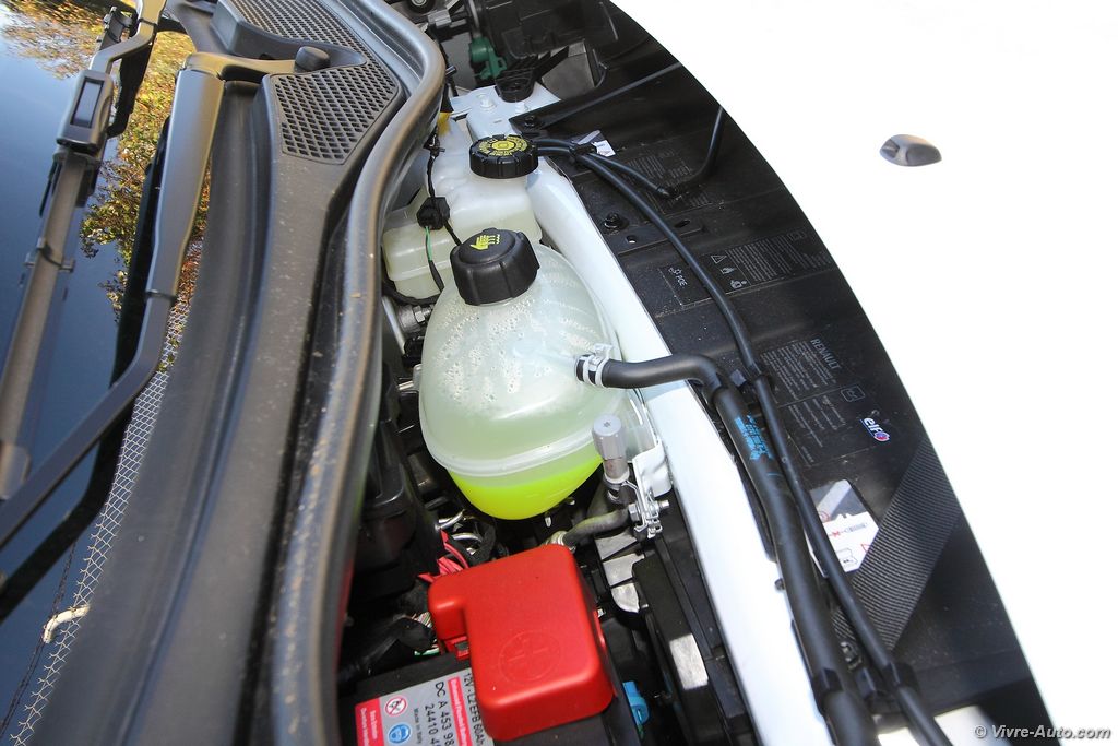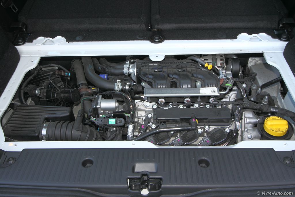 Renault Twingo 3 - essai sur Vivre AutoLa nouvelle Twingo est proposée avec deux motorisations essences, le premier, un trois cylindres de 0,999 l qui développe 70 ch, le second, un trois cylindres turbo de 90 ch. Notre modèle d’essai était équipé de ce dernier, déjà présent sur certains modèles comme la Clio ou le Captur, il a subi d’énormes modifications au vu de son implantation et de son inclinaison de 49°. Avec son turbo, il permet d’obtenir un couple de 135 Nm (contre 91 Nm pour le 70 ch) et offre des performances correctes. Le 0 à 100 km/h est abattu en 10.8 secondes pour une vitesse maximale de 165 km/h. En ville, la citadine est vraiment très agréable, la direction est légère, du à l’absence de moteur sur le train avant, et surtout le rayon de braquage est excellent ! Les roues braquent à 45°, un vrai régal pour les manœuvres. Ce trois cylindres est très en accord avec la voiture, il ajoute même un côté dynamique assez sympa, avec une sonorité agréable et des montées en régime franches. Si son terrain de prédilection est normalement la ville, lorsque l’on emprunte les routes à son bord, on se rend compte qu’elle est aussi à l’aise dans ce milieu. On peut le dire, la Twingo est polyvalente. Le comportementRenault Twingo 3 - essai sur Vivre Auto routier est irréprochable, malgré le poids contenu, moins d’une tonne, et la transmission aux roues arrière, nous avons constatés aucun mouvement de caisse. Les ingénieurs ont obtenus une répartitions des masses presque équitable, de plus, l’antidérapage réagit assez vite. Le confort est un peu plus ferme que sur l’ancienne génération surtout à basse vitesse en 16 pouces, une monte en 15 pouces est préférable si vous n’aimez pas ce type de conduite. Annoncée avec une moyenne de 4,3 l/100 km, la consommation durant notre essai était comprise entre 6 et 7 l/100 km. Un mode eco permet de réduire ces chiffres en interagissant sur l’accélérateur mais nous l’utilisions qu’en agglomération, car il gâche le côté dynamique. Le Stop&Start, livré de série avec cette mécanique, s’est montré sans reproche. Le freinage est efficace en toutes Renault Twingo 3 - essai sur Vivre Autocirconstances et la boîte de vitesses est douce avec des rapports qui s’enchaînent rapidement. L’année prochaine, Renault proposera sa boîte automatique à double embrayage. Et quel impact sur l’entretien ? La position du moteur implique quelques efforts supplémentaires pour contrôler le niveau d’huile ou faire les niveaux. Nous avons souhaités voir cela de plus prés, à commencer par le moteur. Une fois les deux couches de tapis de coffre et d’isolant enlevés, il faut dévisser six vis papillons pour dégager la plaque de fixation. On accède ainsi au moteur et à la tirette d’huile. Il faut alors se rendre à l’opposé de la voiture pour faire l’appoint des autres niveaux. A l’aide de deux tirettes dissimulées derrière deux caches en plastique aux extrémités du logo, on déverrouille le capot, qui glisse en le tirant vers soi. Il n’y a donc rien de compliqué mais cela demande un peu plus de temps que sur une voiture à moteur avant.