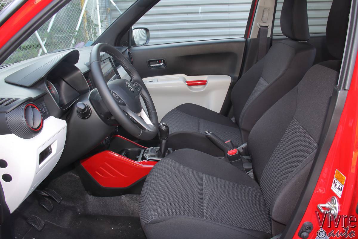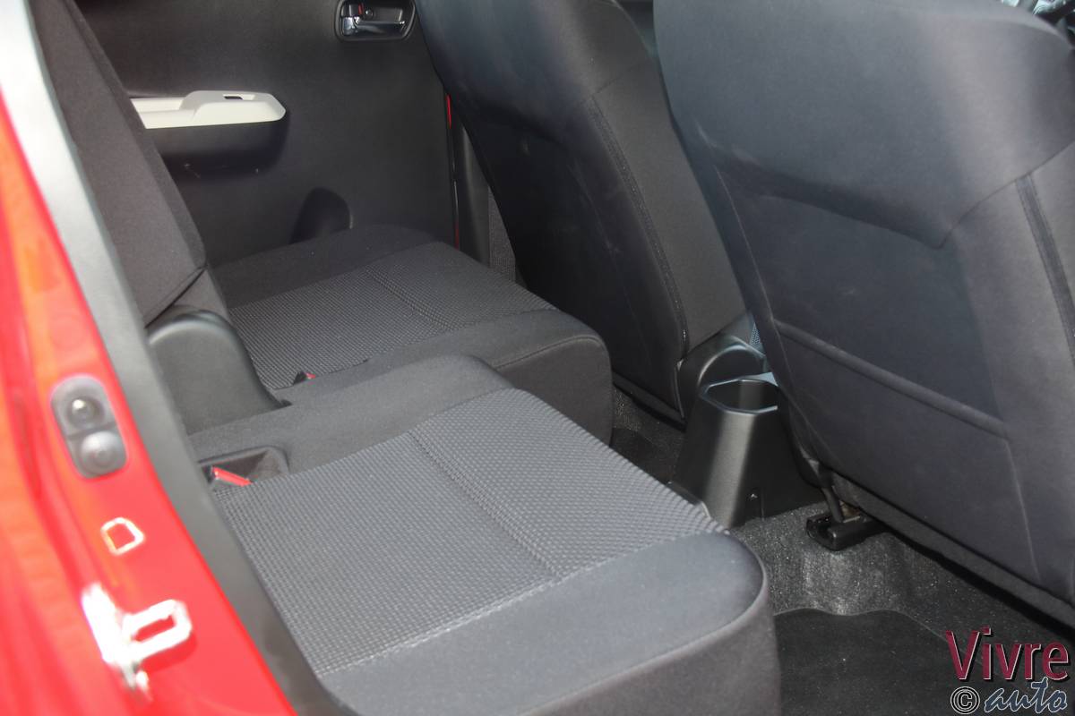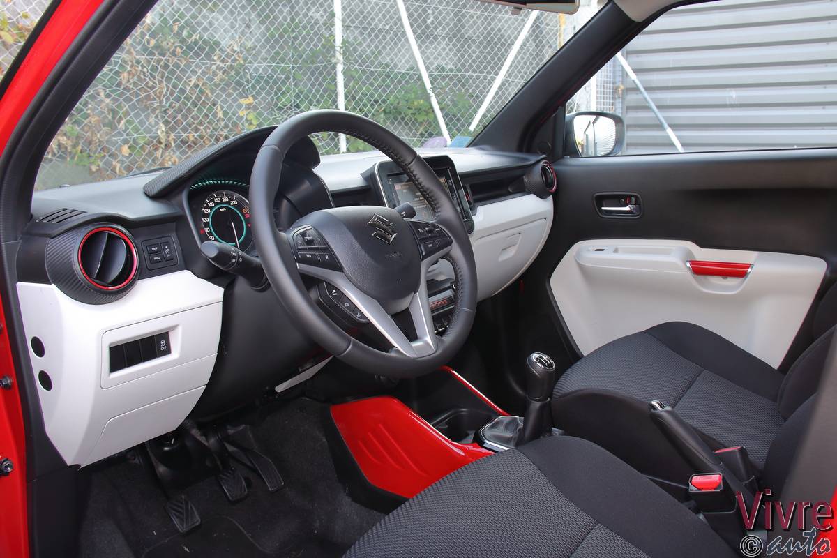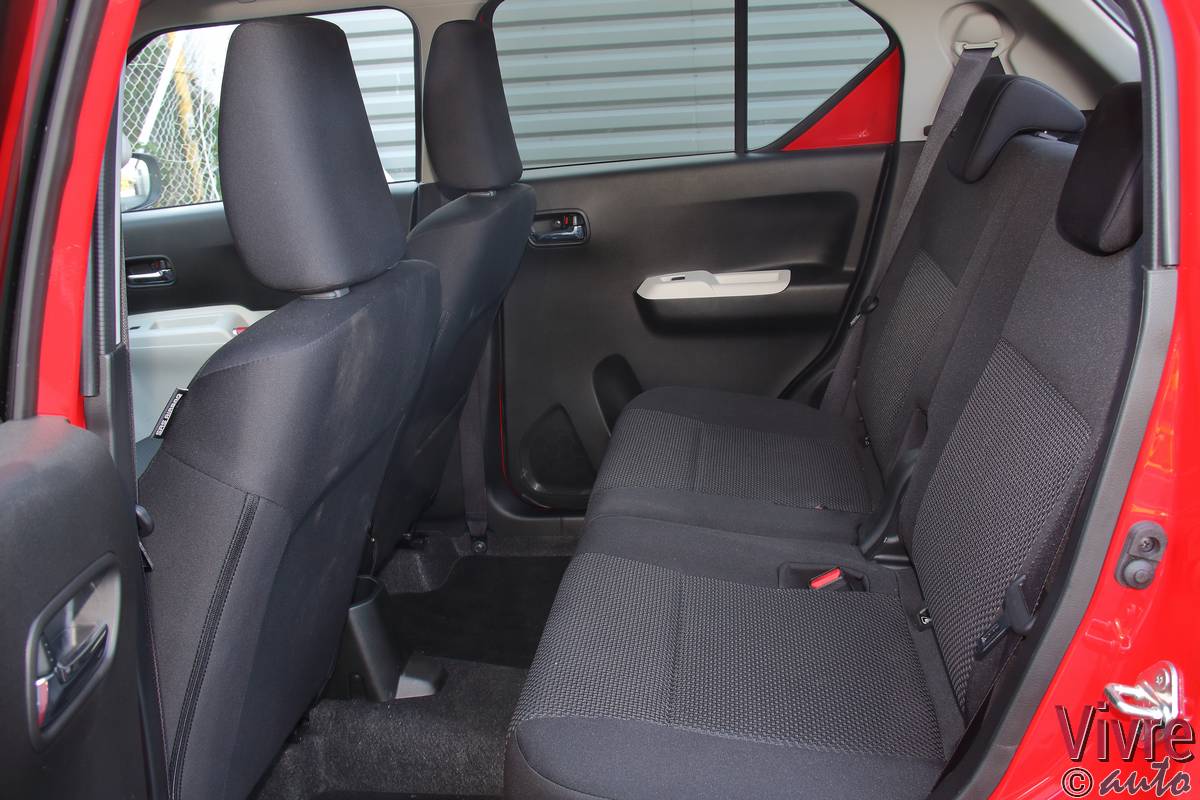 En ouvrant la porte, on découvre un habitacle à l’image de l’extérieur : joyeux et bicolore. Si les plastiques sont exclusivement durs, les assemblages sont sérieux et l’ergonomie est simplifiée au maximum. Mais le vrai point fort de l’Ignis réside dans son habitabilité. Grâce à sa banquette arrière coulissante sur 16 cm (en deux parties), on peut choisir entre un espace aux jambes digne d’une limousine ou un volume de coffre très correct pour le gabarit (jusqu’à 340 litres).