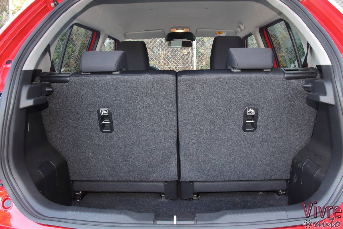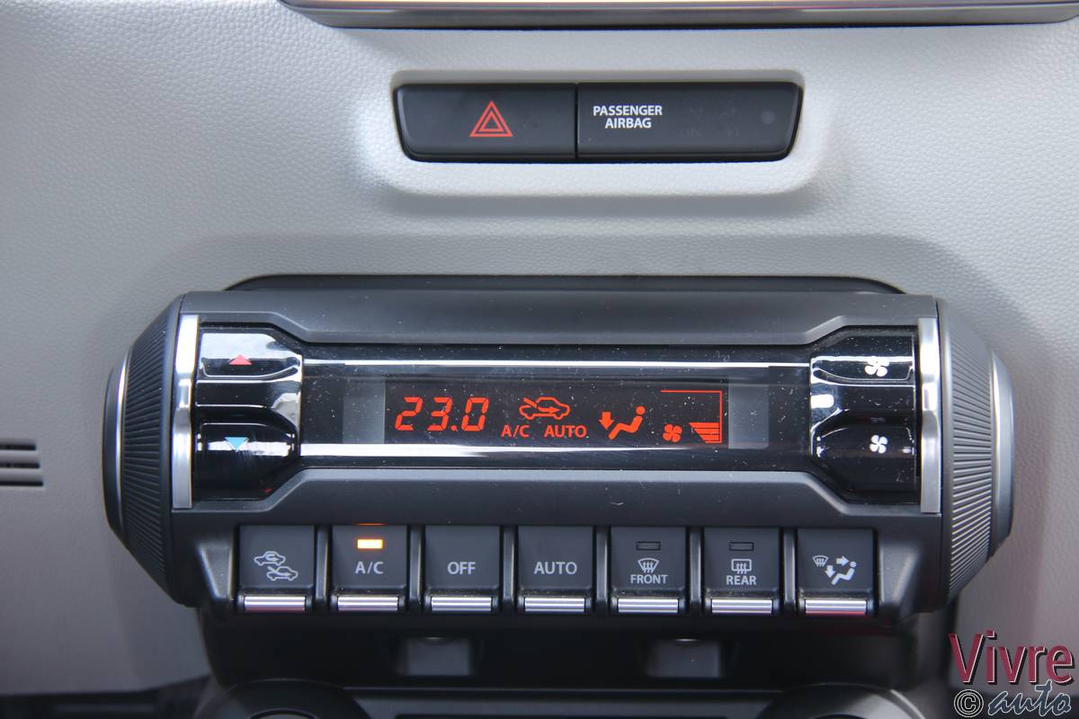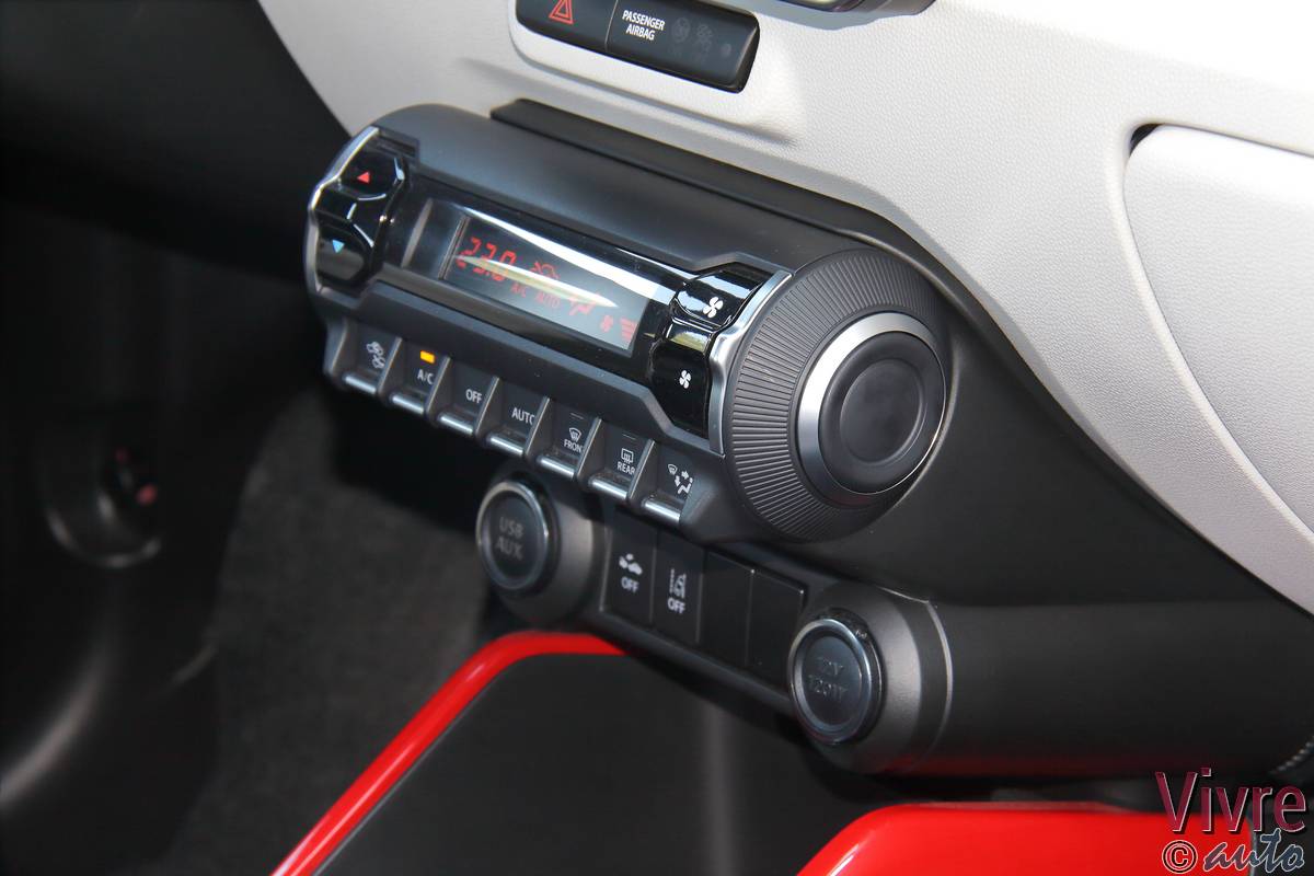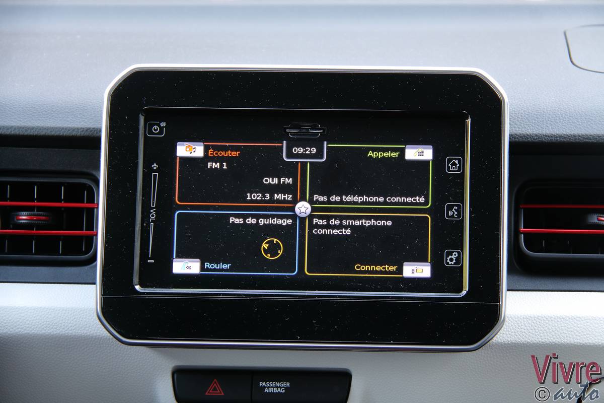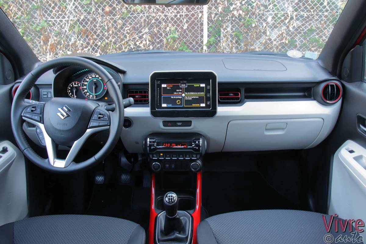 En ouvrant la porte, on découvre un habitacle à l’image de l’extérieur : joyeux et bicolore. Si les plastiques sont exclusivement durs, les assemblages sont sérieux et l’ergonomie est simplifiée au maximum. Mais le vrai point fort de l’Ignis réside dans son habitabilité. Grâce à sa banquette arrière coulissante sur 16 cm (en deux parties), on peut choisir entre un espace aux jambes digne d’une limousine ou un volume de coffre très correct pour le gabarit (jusqu’à 340 litres).
