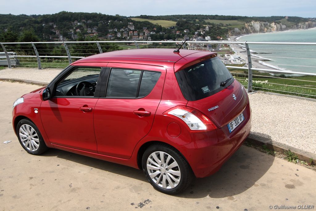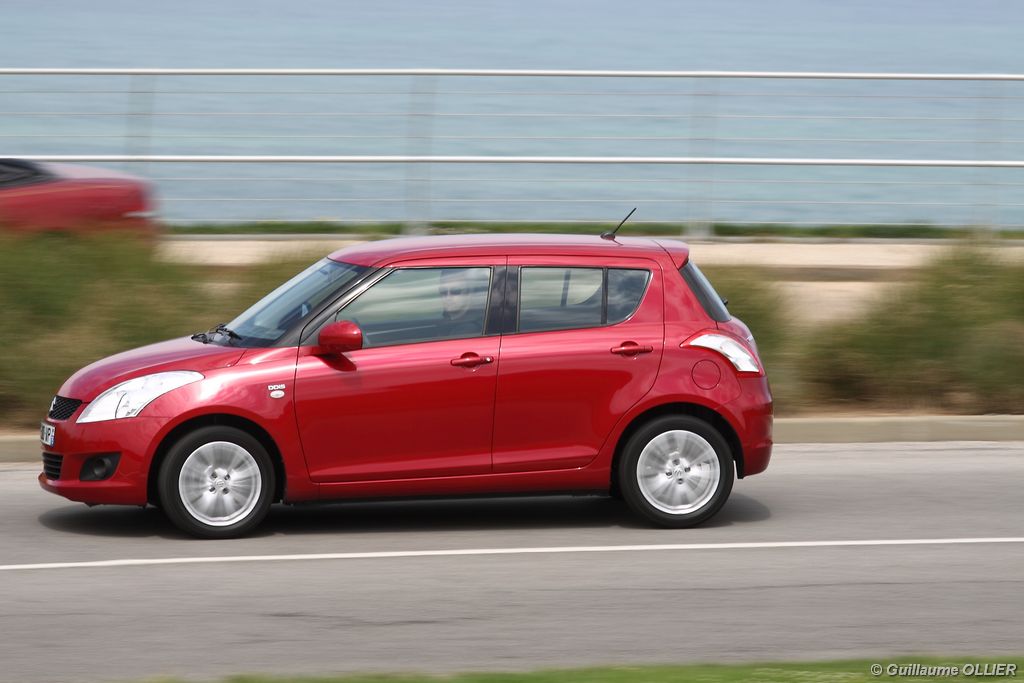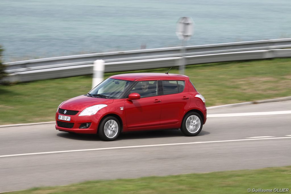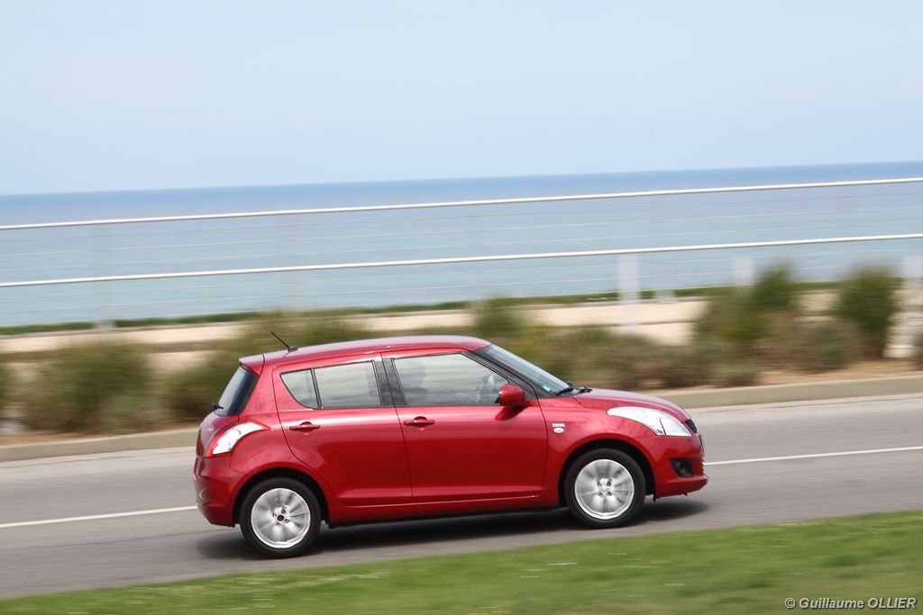 Deux moteurs sont proposés sous le capot de la nouvelle Swift, un 4 cylindres essences 1.2, et un 4 cylindres Diesel de 1.3 Nous avons pris la route avec les deux. Le 1,2 l VVT développe une puissance de 94 ch à 6 000 tr/min, et un couple de 118 Nm à 4 000 tr/min. En Diesel, le 1.3 DDiS développe 75 ch à 4000 tr/min, et un couple de 190 Nm disponible à 1 750 tr/min. Le moteur essence est inédit et remplace l’ancien 1.3 de 92 ch. Très silencieux, il est idéal pour la ville. Sur route il faut en revanche monter dans les tours à cause de son manque de souplesse à bas régime. C’est à ce moment que l’on apprécie la maniabilité de la boîte de vitesse manuelle. Sur autoroute, la sonorité est en revanche trop importante et un sixième rapport n’aurait pas été de refus… Le bloc Diesel, lui, n’a pas changé mais il a été retravaillé afin de baisser les consommations et les rejets de CO2 de 150 g à 109 g. Malgré ses 75 ch il s’en sort plutôt bien, avec des rapports de transmission courts et une bonne vitalité passé les 1 800 tr/mn. Aucun problème donc pour s’insérer sur les routes. Mais comme pour le 1.2 VVT, sur autoroute, la sonorité devient trop importante. Le moteur essence s’est montré très sobre, avec une moyenne oscillant aux alentours de 6l/100 km sur un parcours mixte. Le 1.3 DDiS est un peu moins gourmand avec une moyenne de 5l/100 km. Comme avec la génération précédente, la japonaise est exemplaire sur la route. Toujours aussi agile et collée à la route, elle peut ainsi être sollicitée sur les petites routes. Le train avant et le freinage ne souffrent d’aucune critique. La où nous avons constaté du changement, c’est au niveau du confort de suspension, c’est moins ferme qu’auparavant.