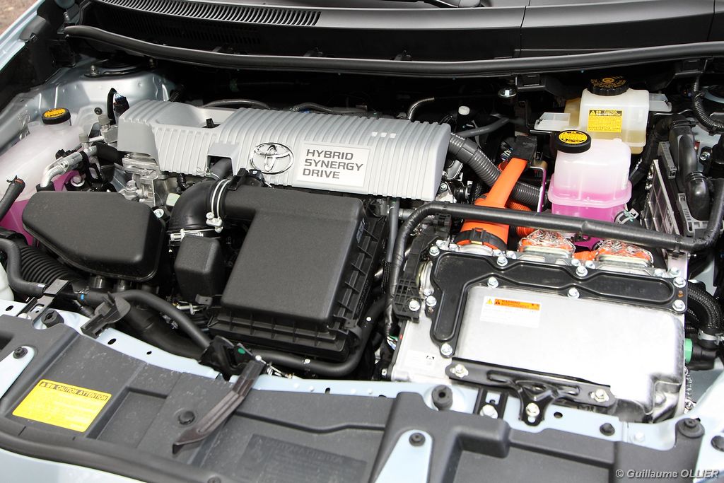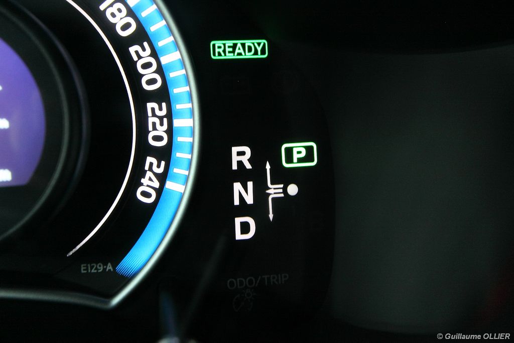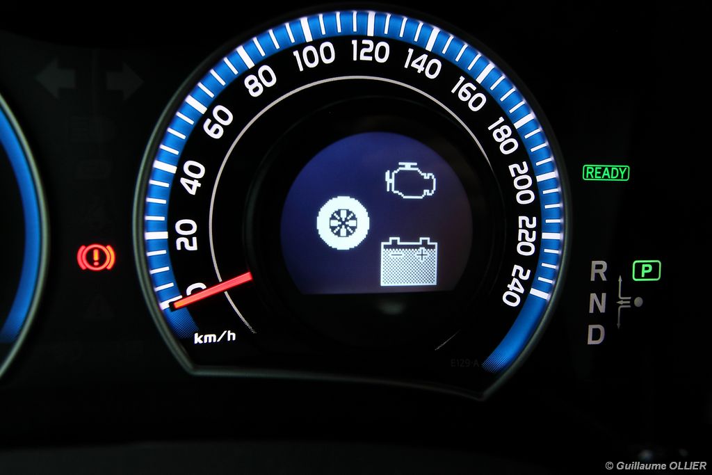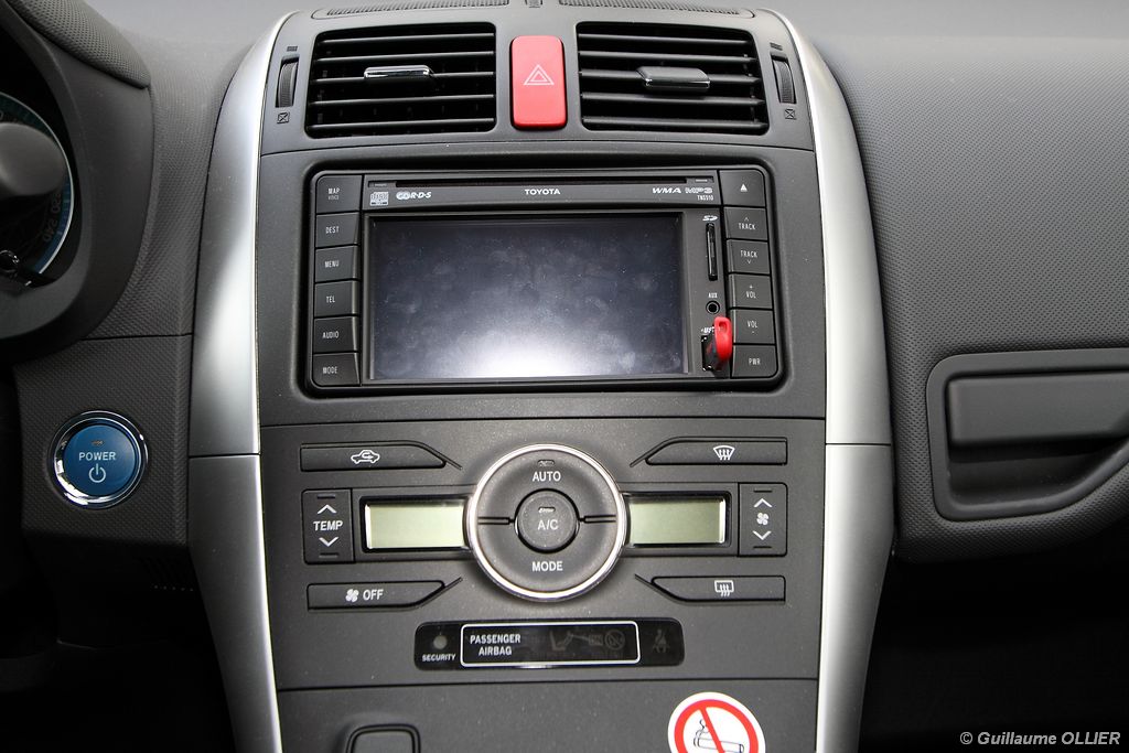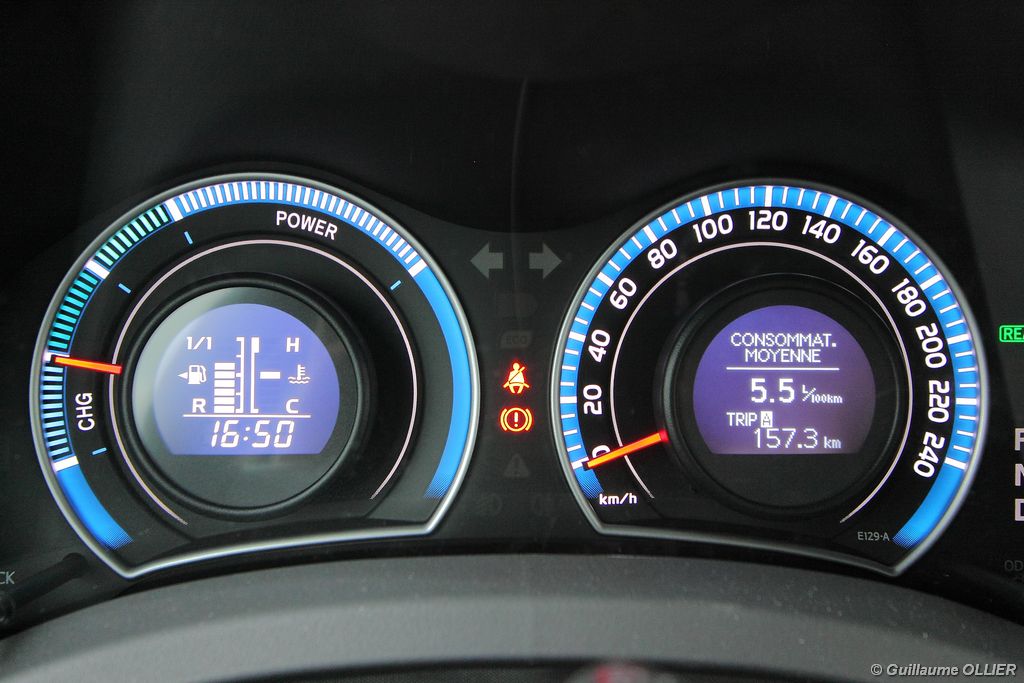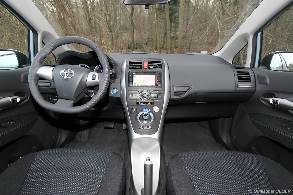 L’Auris Hybride reprend toute la mécanique de la Prius. Rappelons le fonctionnement du système HSD (Hybrid Synergy Drive) de Toyota. Un moteur thermique, ici de 99 ch est assisté par un moteur électrique de 82 ch afin de réduire les consommations de carburant. Tout se gère automatiquement sans intervention du conducteur. Au démarrage, le véhicule utilise le moteur électrique seul et peut parcourir jusqu’à 2 km avec une vitesse maximale de 50 km/h. En conduite normale les deux moteurs entrainent la voiture, et lorsque vous sollicitez l’accélérateur le moteur thermique prend le dessus, mais toujours avec l’assistance de l’électrique. La batterie haute tension située dans le coffre est rechargée automatiquement par un alternateur et un dispositif de récupération de l’énergie lors des phases de décélération ou de freinage. Nous l’avons remarqué tout de suite lors de la prise en main du véhicule avec un bruit de frottement aux roues lors des arrêts. A la place d’un compte-tours classique, l’Auris dispose d’un compteur nommé Opitron, celui-ci vous informe sur le fonctionnement du système hybride. Il est partagé en quatre zones, « Charge » lorsque la batterie se recharge, « Hybrid ECO » seul le moteur thermique fonctionne, « ECO Drive » moteur thermique et électrique sont associés, et « Power », lors des phases d’accélération importantes. Avec cet élément nous avons tendance à rouler paisiblement afin de ne pas quitter les deux zones ECO matérialisées par du vert, c’est ainsi considéré comme une assistance à l’ « éco-conduite ». Avec une puissance combinée de 136 ch l’Auris Hybride bénéficie d’accélérations convenables, mais les reprises sont trop justes. Avec un silence de fonctionnement à basse vitesse et aucune vibration, l’Auris est parfaite pour la ville. Sur