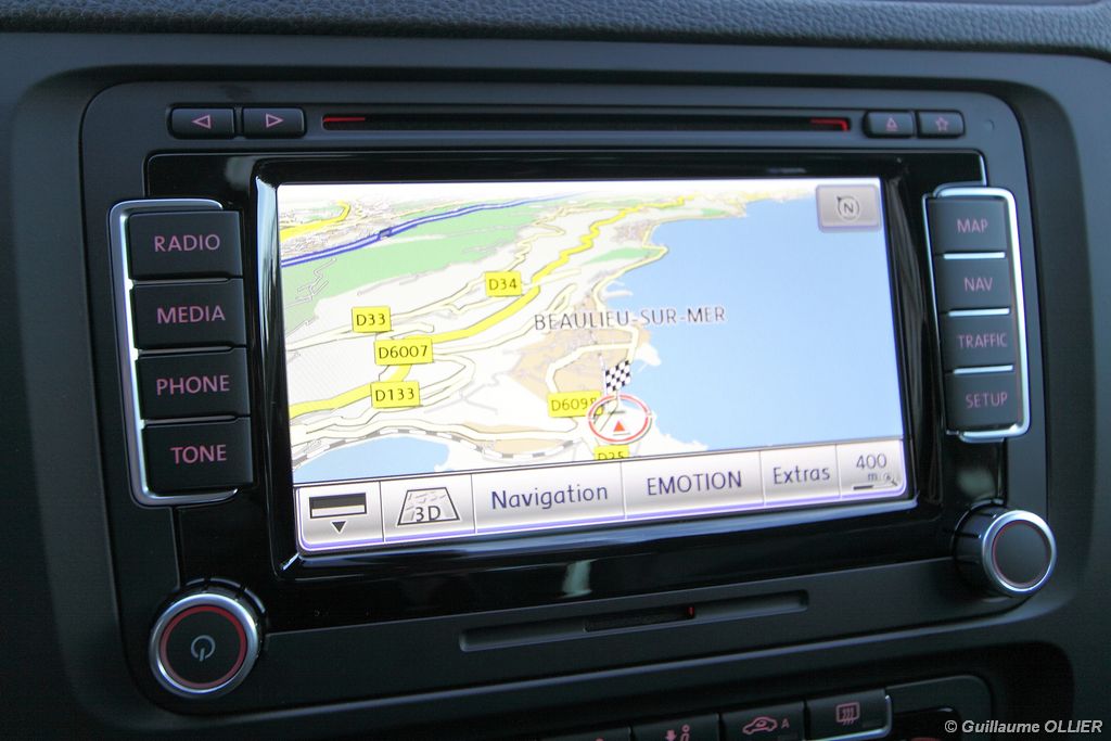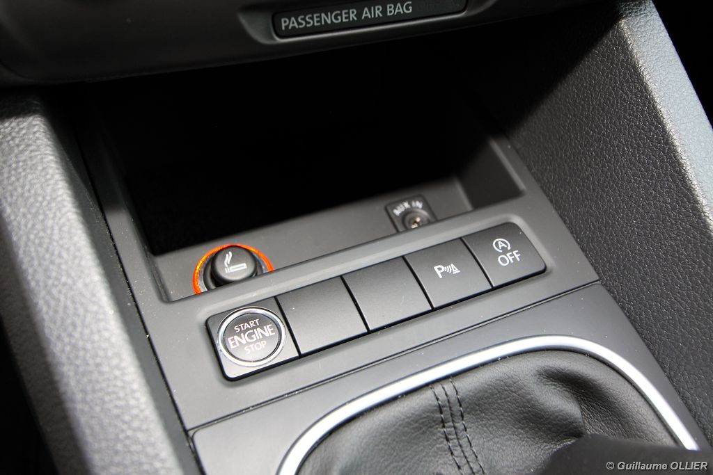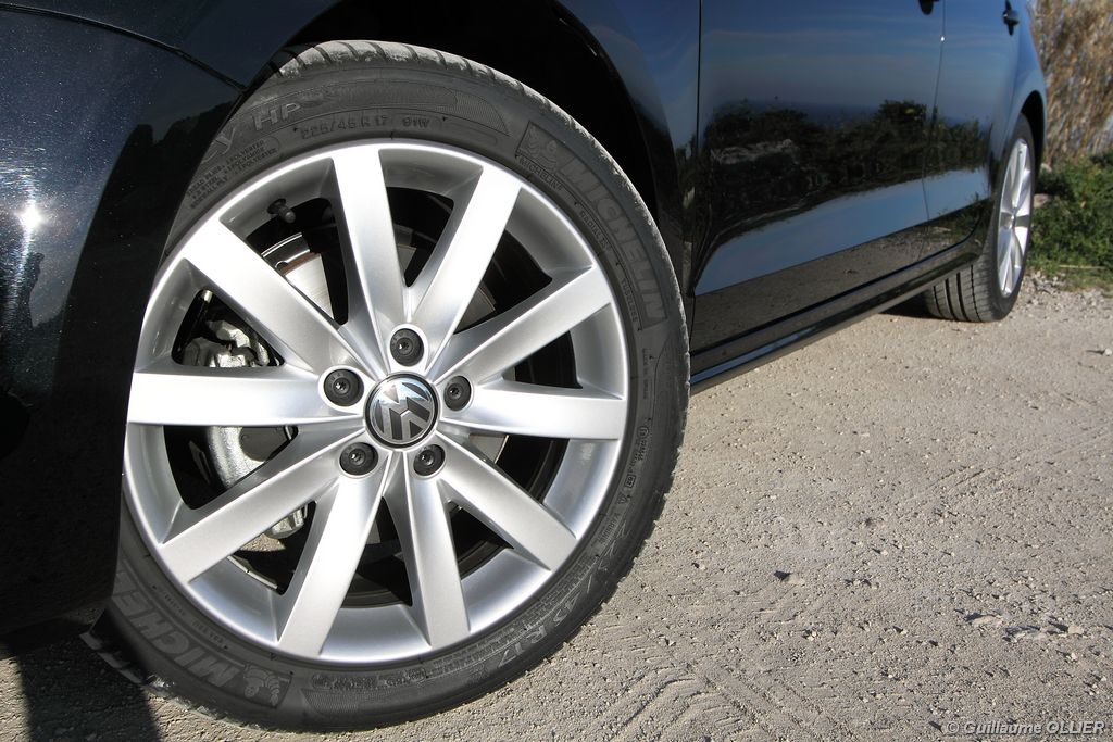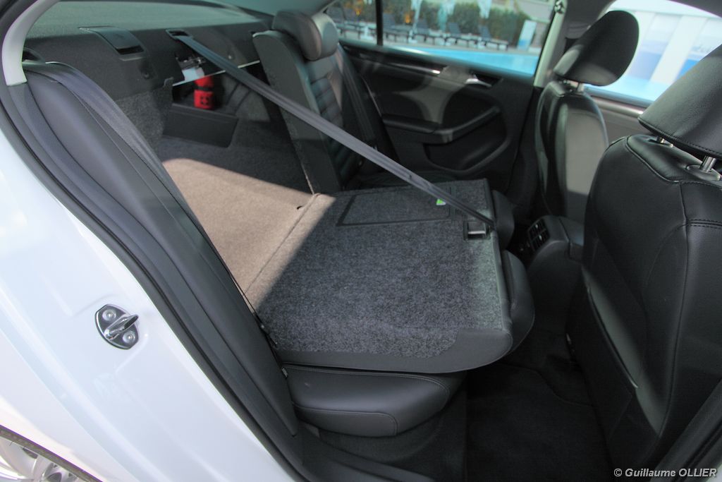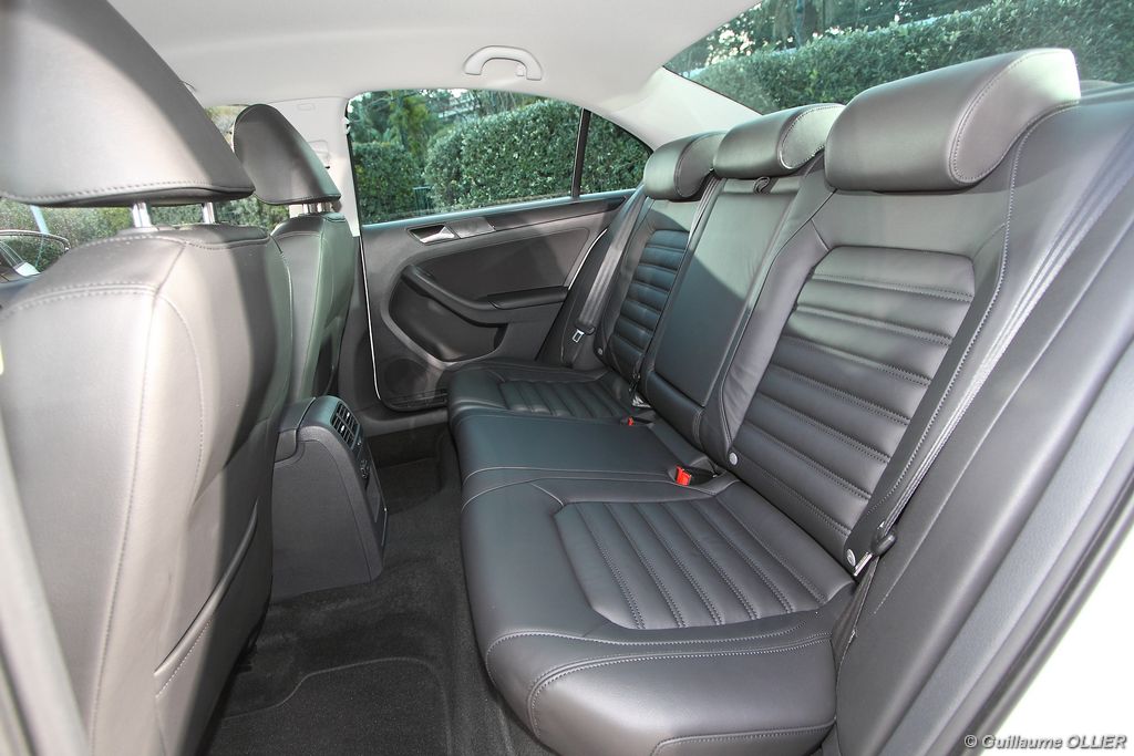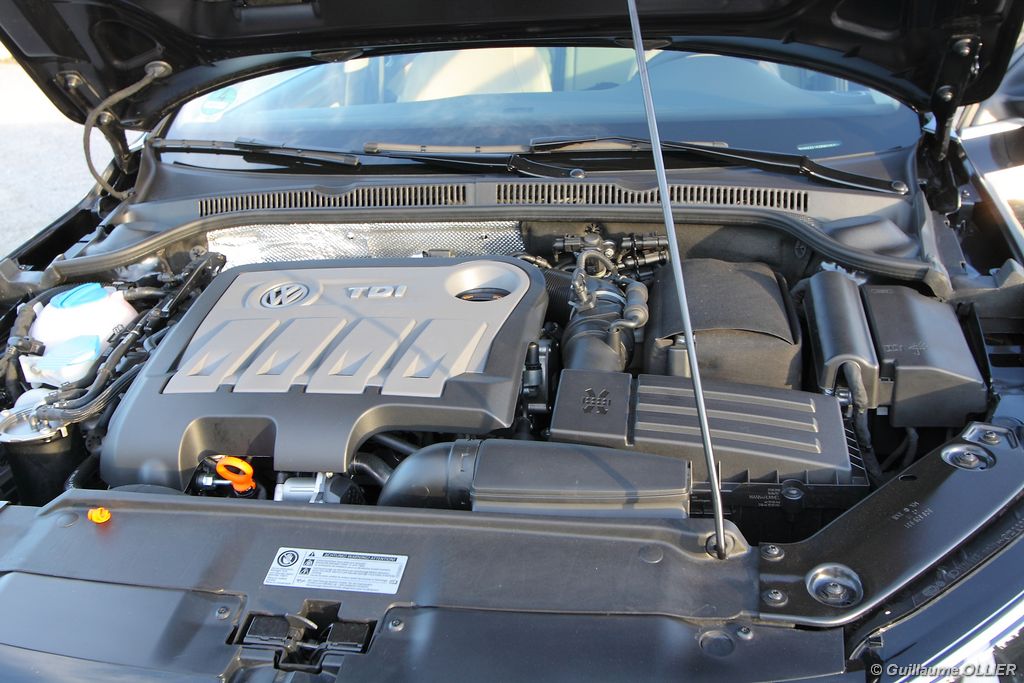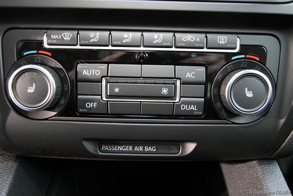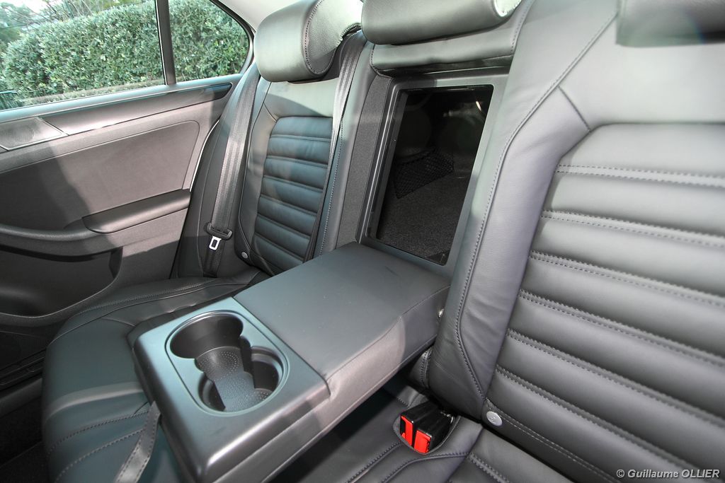 L’intérieur ressemble à celui de la Golf, mais il existe plusieurs différences tout de même. A commencer par la console centrale qui est légèrement orientée vers le conducteur, les grilles d’aérations sont plus rectangulaires, et les contreportes modifiées. L’ensemble reste sobre et la finition ne souffre pas de reproche particulier. Les commandes tombent aisément sous la main et l’instrumentation est très lisible. Le volant cuir trois branches est agréable au toucher, et les sièges avant offrent un bon maintien latéral. Le coffre offre un volume de chargement très généreux avec 510 litres, c’est 55 litres de moins que la Passat. Il peut s’ouvrir à l’aide de la télécommande ou depuis l’intérieur, son accès est cependant étroit. La banquette arrière se rabat, et contient une trappe à ski. La qualité de cette dernière laisse à désirer, lorsqu’on l’ouvre elle tombe dans le coffre… Les espaces de rangements à bord sont multiples, porte-lunettes, porte-gobelets ne manqueront pas. A noter l’option Pack Rangement facturée 119€ (sur Confortline) qui ajoute des tiroirs sous les sièges avant et un filet de coffre.