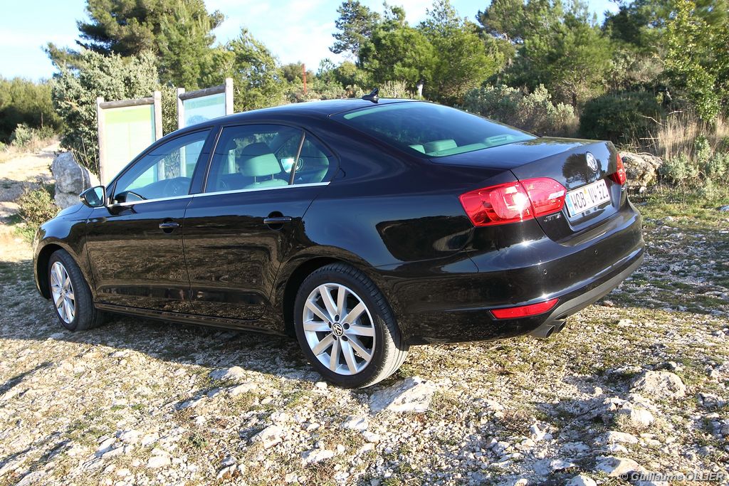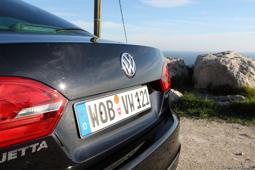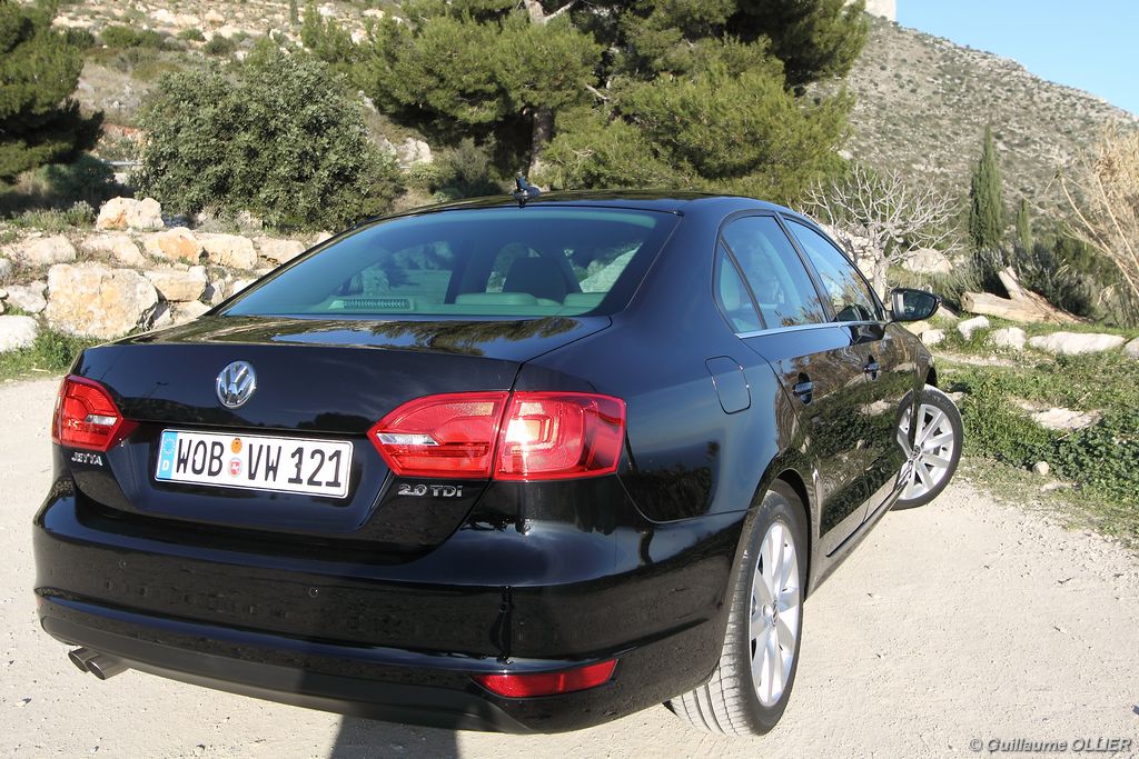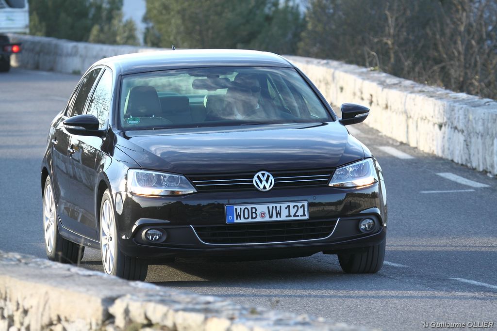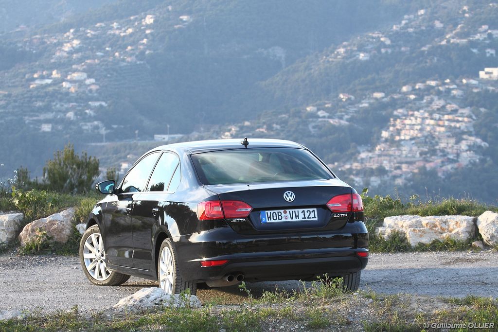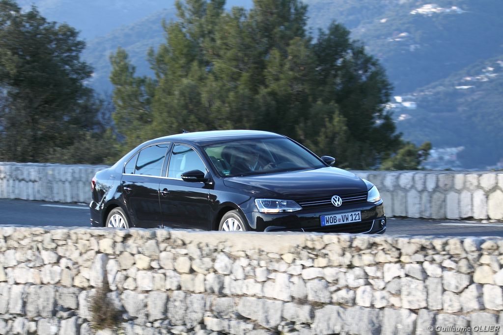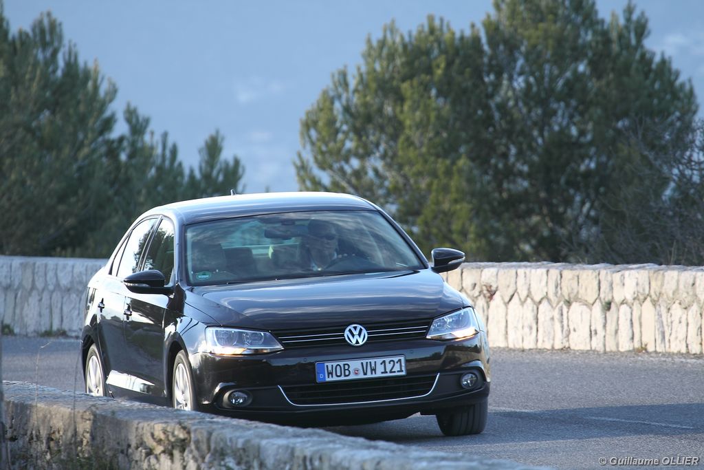 moins. Parlons justement des consommations de carburant. Sur nos deux modèles d’essai nous avons relevé des moyennes tournant autour des 6 l/100 km. Un bon point d’autant plus que nous avions comme transmission la boîte automatique à double embrayage DSG à 6 vitesses pour le TDi 140 et 7 vitesses pour le TDi 105. Cette dernière nous a satisfait, elle procure une conduite apaisée et réagit bien à la moindre sollicitation de la pédale d’accélérateur. Dommage que les palettes au volant soit en option (116 €). Un surcoût de 1 440€ ou 1 830€ vous sera demandé selon les versions si vous optez pour la DSG. La voiture s’est très bien comportée sur les petites routes de l’arrière pays niçois, et elle prend très peu de roulis. Le confort est de bon niveau et les longs trajets sont fait pour la Jetta. Seul reproche, le freinage manque un peu d‘efficacité. Au chapitre sécurité, la Jetta bénéficie de série de 6 airbags, mais elle inaugure surtout un tout nouveau système de capteurs de collision qui permet suivant le type d’accident le déploiement des airbags plus rapidement et d’adapter les prétensionneurs de ceinture.