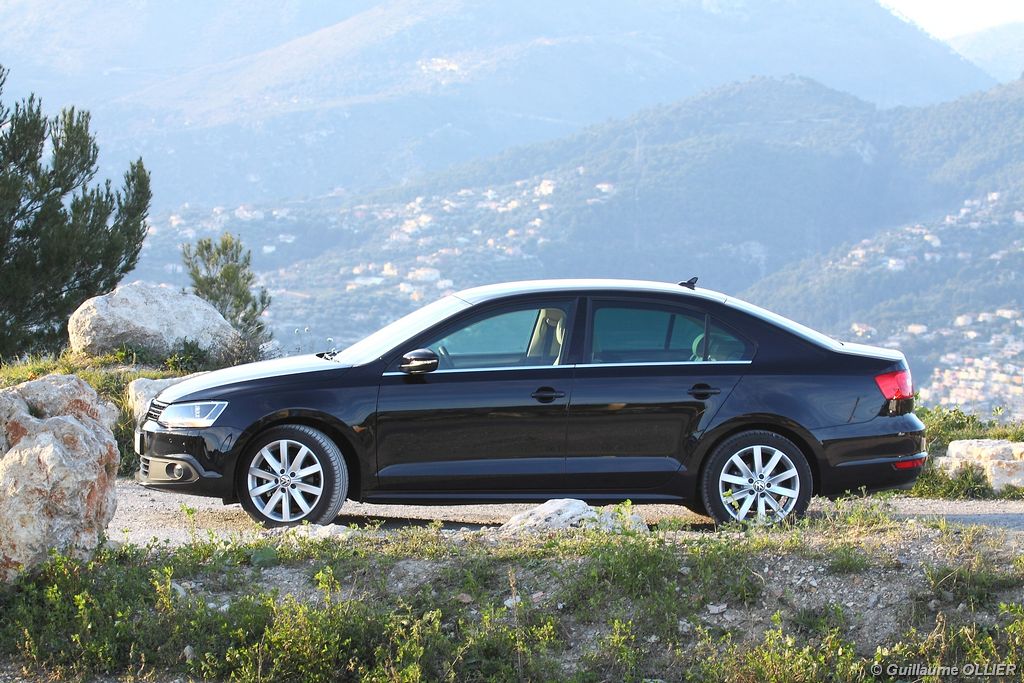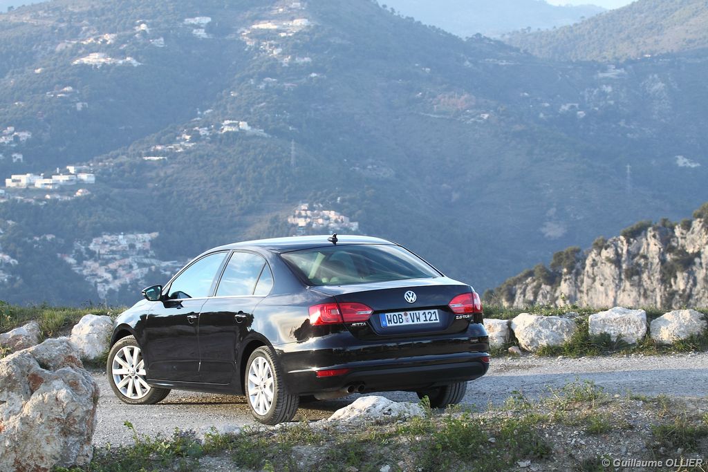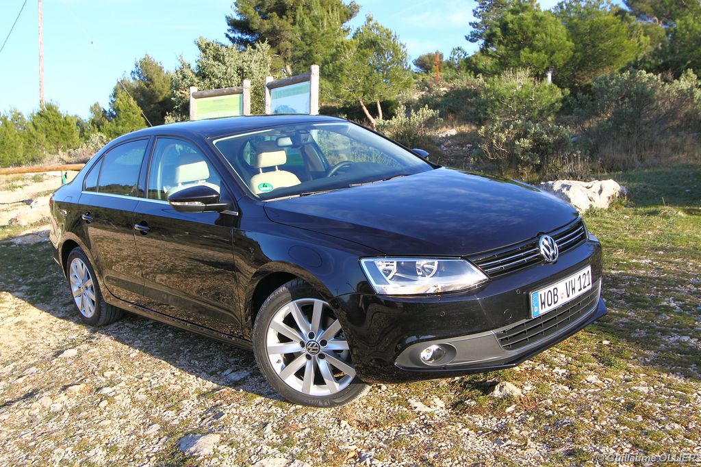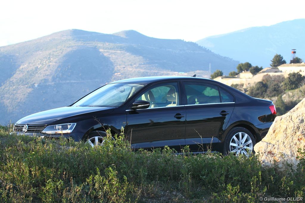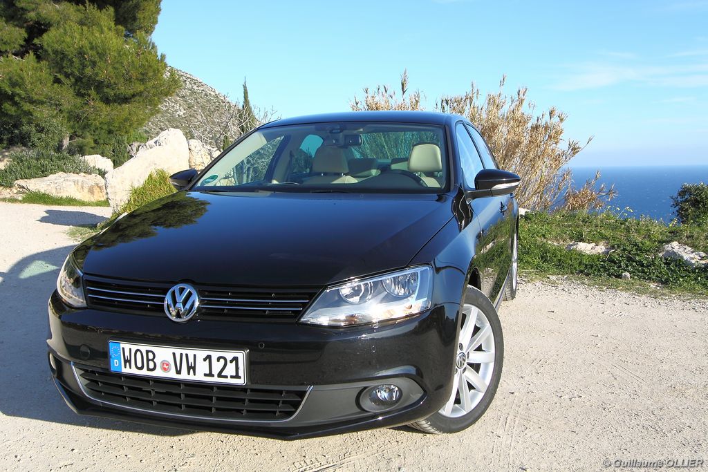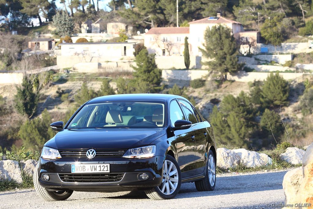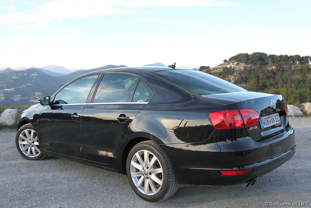 moins. Parlons justement des consommations de carburant. Sur nos deux modèles d’essai nous avons relevé des moyennes tournant autour des 6 l/100 km. Un bon point d’autant plus que nous avions comme transmission la boîte automatique à double embrayage DSG à 6 vitesses pour le TDi 140 et 7 vitesses pour le TDi 105. Cette dernière nous a satisfait, elle procure une conduite apaisée et réagit bien à la moindre sollicitation de la pédale d’accélérateur. Dommage que les palettes au volant soit en option (116 €). Un surcoût de 1 440€ ou 1 830€ vous sera demandé selon les versions si vous optez pour la DSG. La voiture s’est très bien comportée sur les petites routes de l’arrière pays niçois, et elle prend très peu de roulis. Le confort est de bon niveau et les longs trajets sont fait pour la Jetta. Seul reproche, le freinage manque un peu d‘efficacité. Au chapitre sécurité, la Jetta bénéficie de série de 6 airbags, mais elle inaugure surtout un tout nouveau système de capteurs de collision qui permet suivant le type d’accident le déploiement des airbags plus rapidement et d’adapter les prétensionneurs de ceinture.