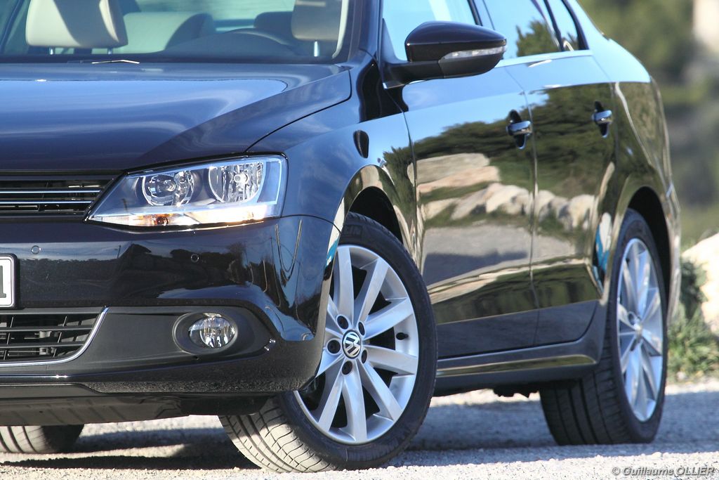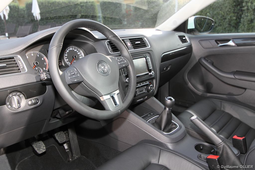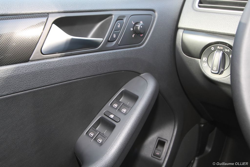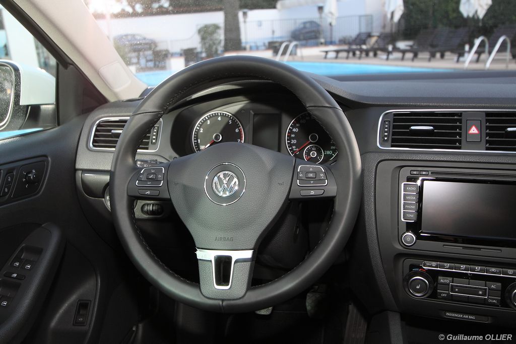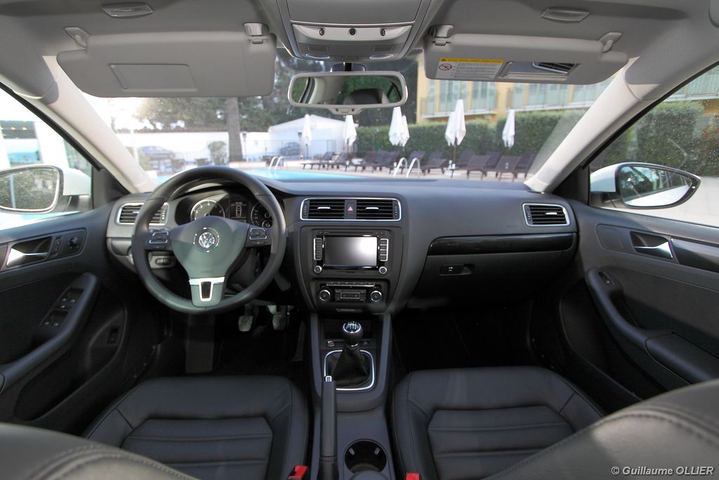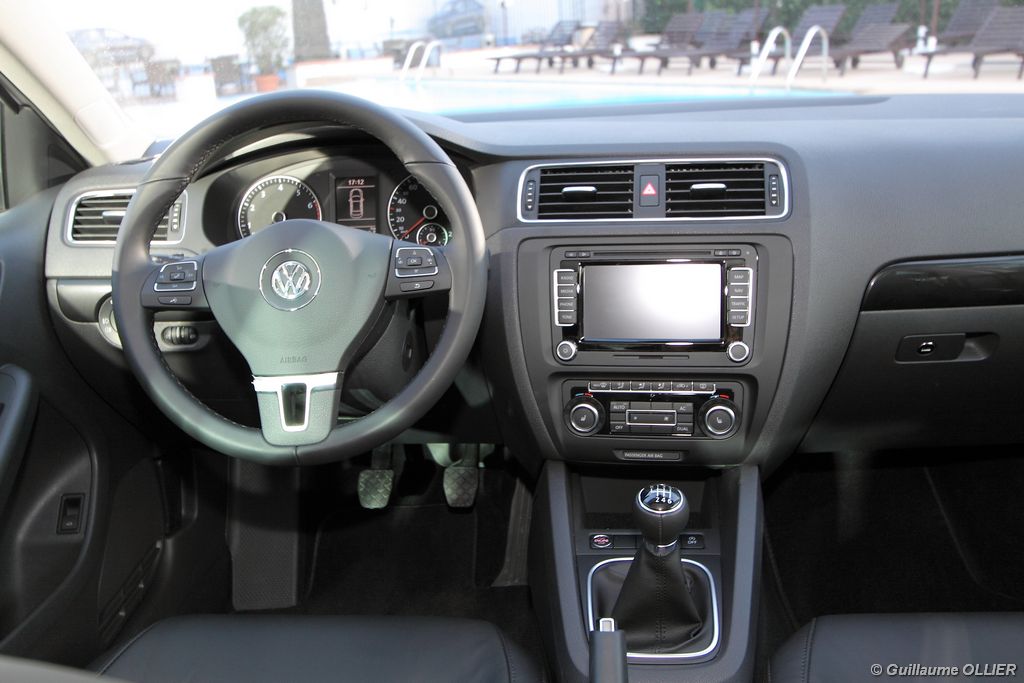 27Trois niveaux de finition sont proposés : Trendline, Confortline, et Carat. Le premier disposera des équipements suivants : siège conducteur réglable en hauteur, ESP, clignotants impulsionnels, roue de secours, climatisation manuelle, ordinateur de bord, régulateur de vitesse, radio RCD 210 MP3 et jantes an acier 16 pouces. Avec un surcoût de 1 890€ la finition Trendline vous apportera en plus le Pack Visibilité (allumage automatique des feux, essuie-glace automatique, et rétroviseur électrochrome), la climatisation automatique, les radars de stationnement avant/arrière, le radio RCD 310 MP3 (8 HP, prise auxiliaire), le volant cuir multifonction, et quelques espaces de rangements supplémentaires. Enfin, la dernière finition Carat est bien sûr la mieux équipée, avec tout d’abord son châssis sport abaissé de 15 mm, la sellerie cuir, les jantes alliage 17 pouces, les antibrouillards avant, le système de navigation RNS 310, et le Bluetooth. Comptez 3 500 € de plus que le second niveau. Dommage que la prise USB soit en option sur tout les niveaux (173€), tout comme le système de centralisation et de démarrage sans clé (177€). Les autres équipements optionnés sont les suivant : airbags latéraux arrière (312€), le Light Assist qui active et désactive automatiquement les feux de route (150€), et le toit ouvrant (953€). Une gamme Business a fait son apparition, destinée aux professionnels et disponible en TDi 105. Les tarifs sont équivalents à l’ancien modèle avec des équipements supplémentaires, les fidèles apprécieront. Ils débutent à 19 990 € pour la Jetta 1.2 TSi 105 Trendline, et finissent à 31 890 € pour la Jetta 2.0 TDi 40 DSG Carat. En France, il n’existe pratiquement pas de concurrence à la Jetta. On peut nommer la Renault Fluence, elle est vendue quasiment au même tarif, mais avec une gamme bien plus simple. Enfin, la Jetta TDi 105 BlueMotion vous rapportera 400€ de bonus écologique grâce ses rejets de CO² de 109 g/km.