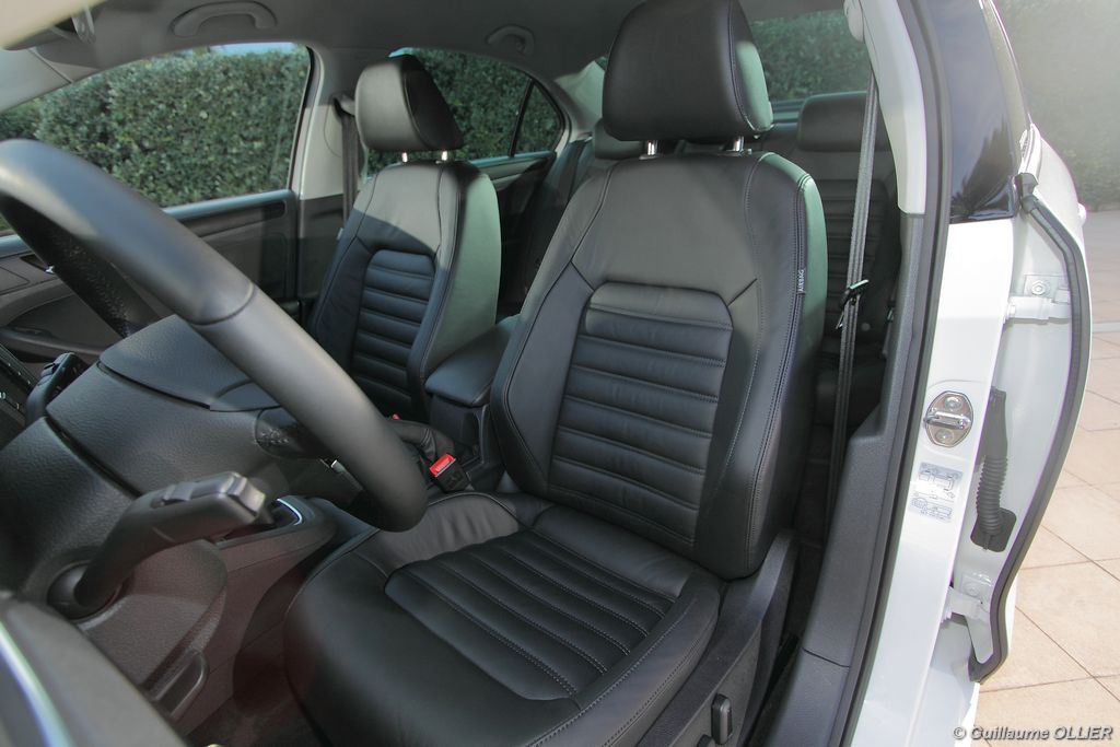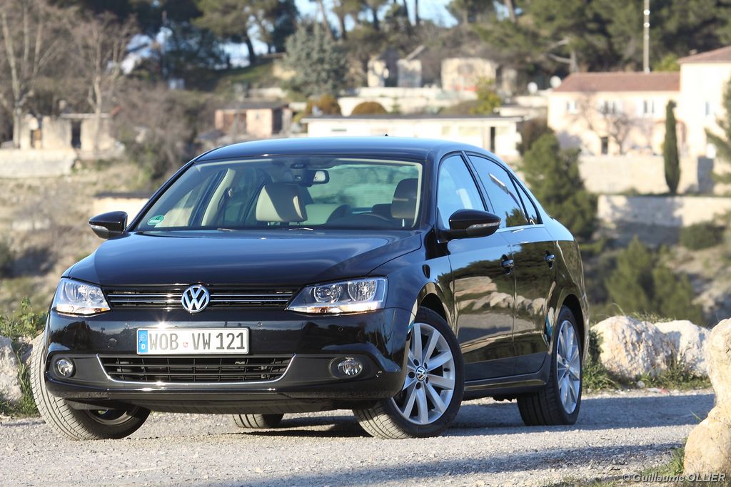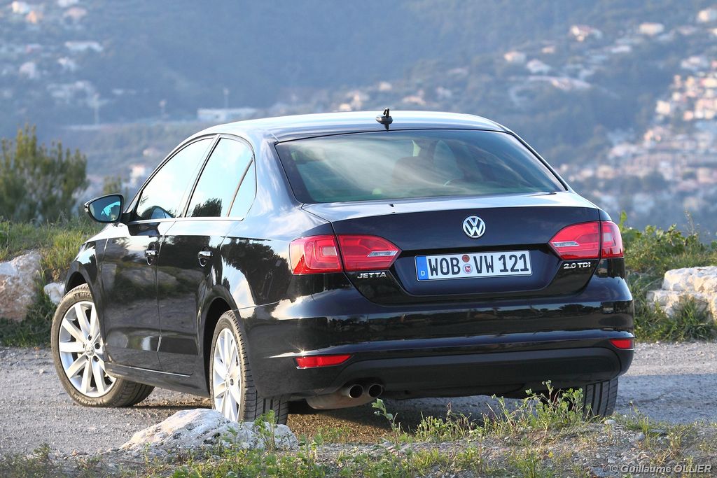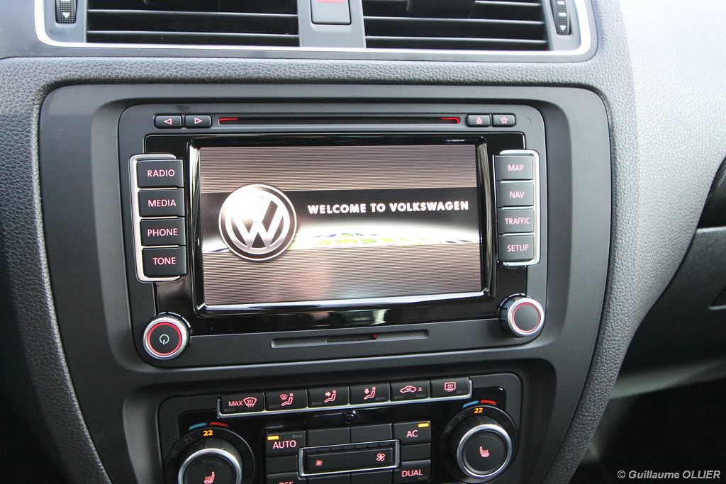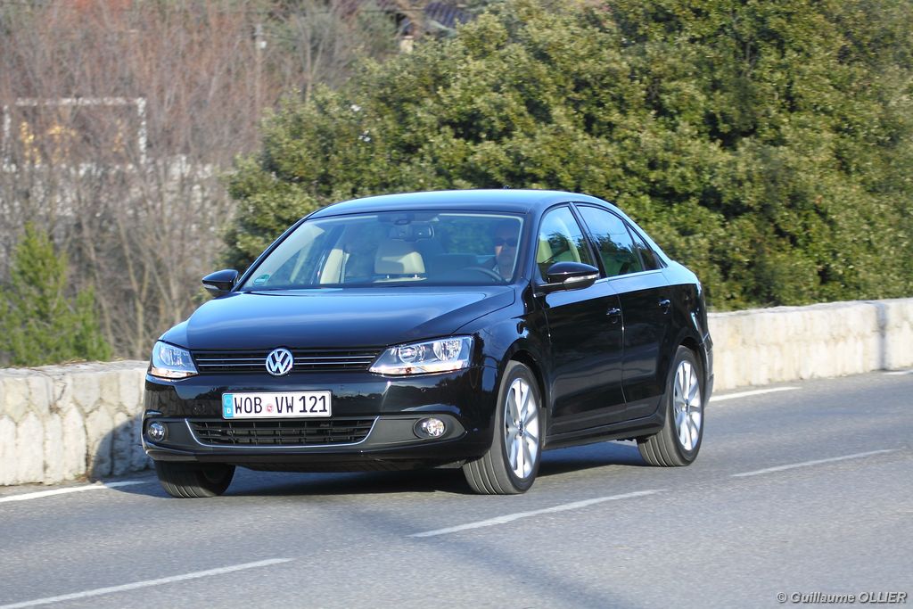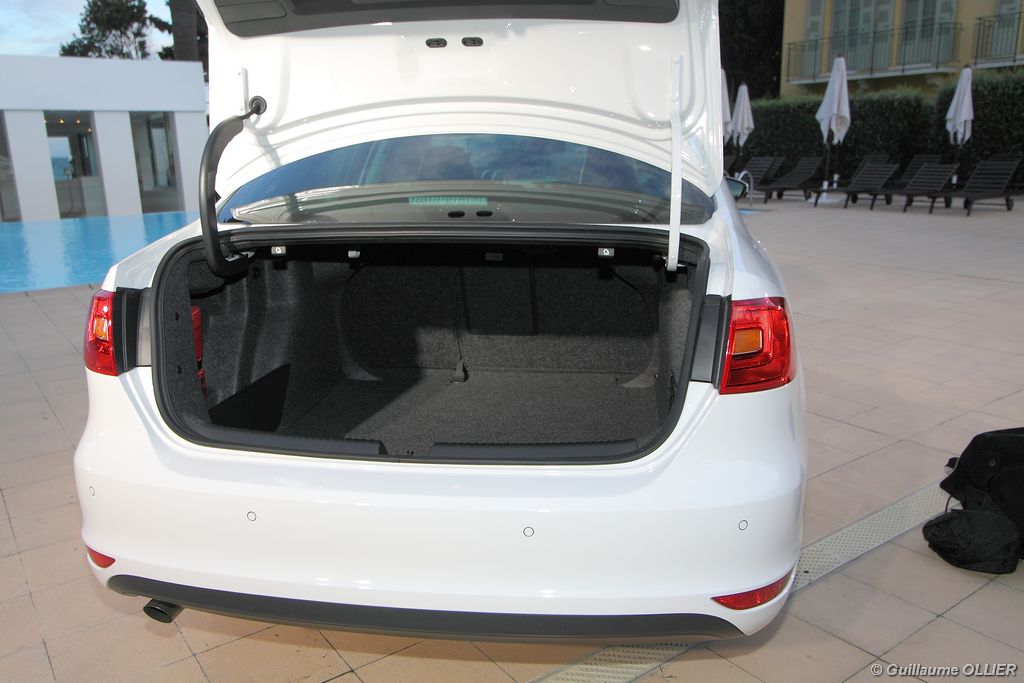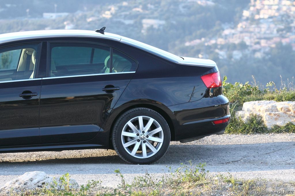 27Trois niveaux de finition sont proposés : Trendline, Confortline, et Carat. Le premier disposera des équipements suivants : siège conducteur réglable en hauteur, ESP, clignotants impulsionnels, roue de secours, climatisation manuelle, ordinateur de bord, régulateur de vitesse, radio RCD 210 MP3 et jantes an acier 16 pouces. Avec un surcoût de 1 890€ la finition Trendline vous apportera en plus le Pack Visibilité (allumage automatique des feux, essuie-glace automatique, et rétroviseur électrochrome), la climatisation automatique, les radars de stationnement avant/arrière, le radio RCD 310 MP3 (8 HP, prise auxiliaire), le volant cuir multifonction, et quelques espaces de rangements supplémentaires. Enfin, la dernière finition Carat est bien sûr la mieux équipée, avec tout d’abord son châssis sport abaissé de 15 mm, la sellerie cuir, les jantes alliage 17 pouces, les antibrouillards avant, le système de navigation RNS 310, et le Bluetooth. Comptez 3 500 € de plus que le second niveau. Dommage que la prise USB soit en option sur tout les niveaux (173€), tout comme le système de centralisation et de démarrage sans clé (177€). Les autres équipements optionnés sont les suivant : airbags latéraux arrière (312€), le Light Assist qui active et désactive automatiquement les feux de route (150€), et le toit ouvrant (953€). Une gamme Business a fait son apparition, destinée aux professionnels et disponible en TDi 105. Les tarifs sont équivalents à l’ancien modèle avec des équipements supplémentaires, les fidèles apprécieront. Ils débutent à 19 990 € pour la Jetta 1.2 TSi 105 Trendline, et finissent à 31 890 € pour la Jetta 2.0 TDi 40 DSG Carat. En France, il n’existe pratiquement pas de concurrence à la Jetta. On peut nommer la Renault Fluence, elle est vendue quasiment au même tarif, mais avec une gamme bien plus simple. Enfin, la Jetta TDi 105 BlueMotion vous rapportera 400€ de bonus écologique grâce ses rejets de CO² de 109 g/km.