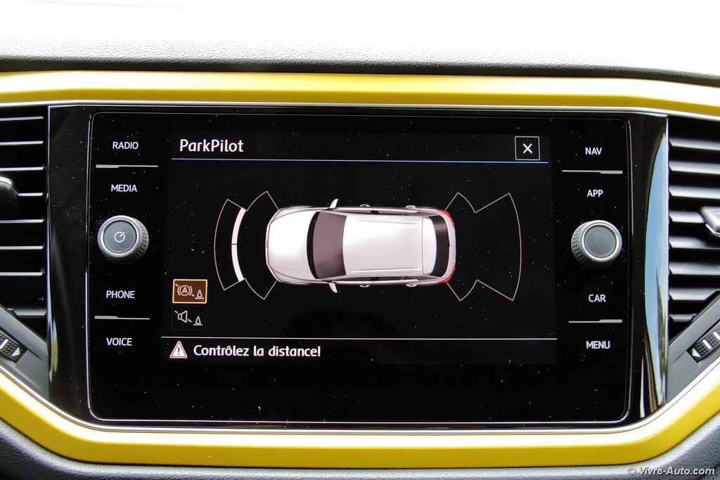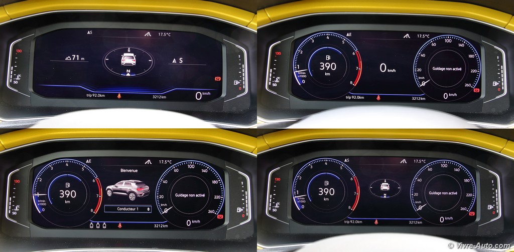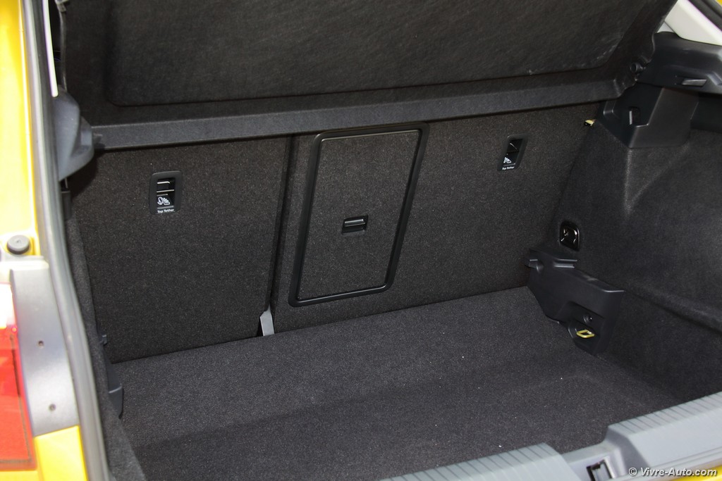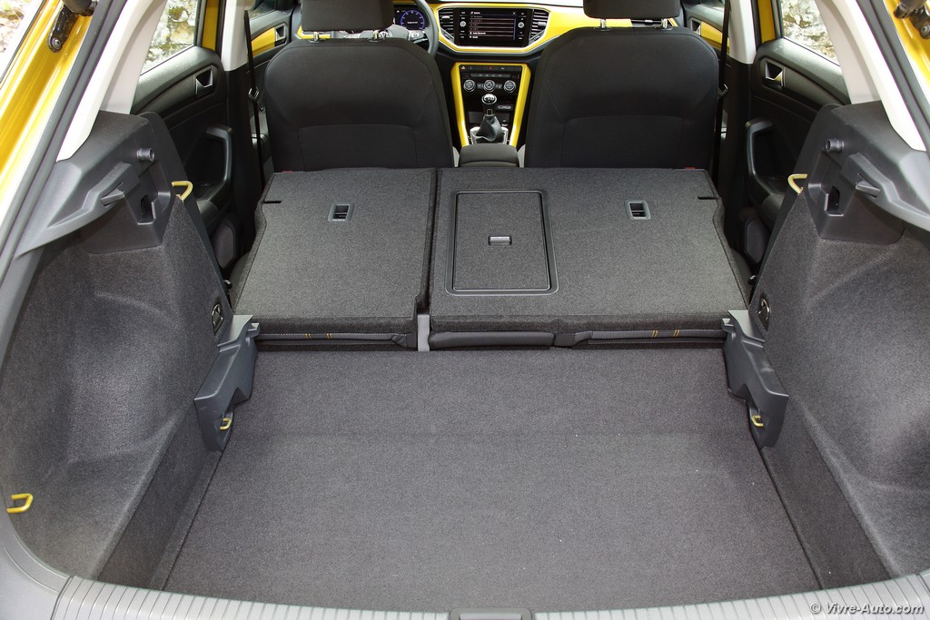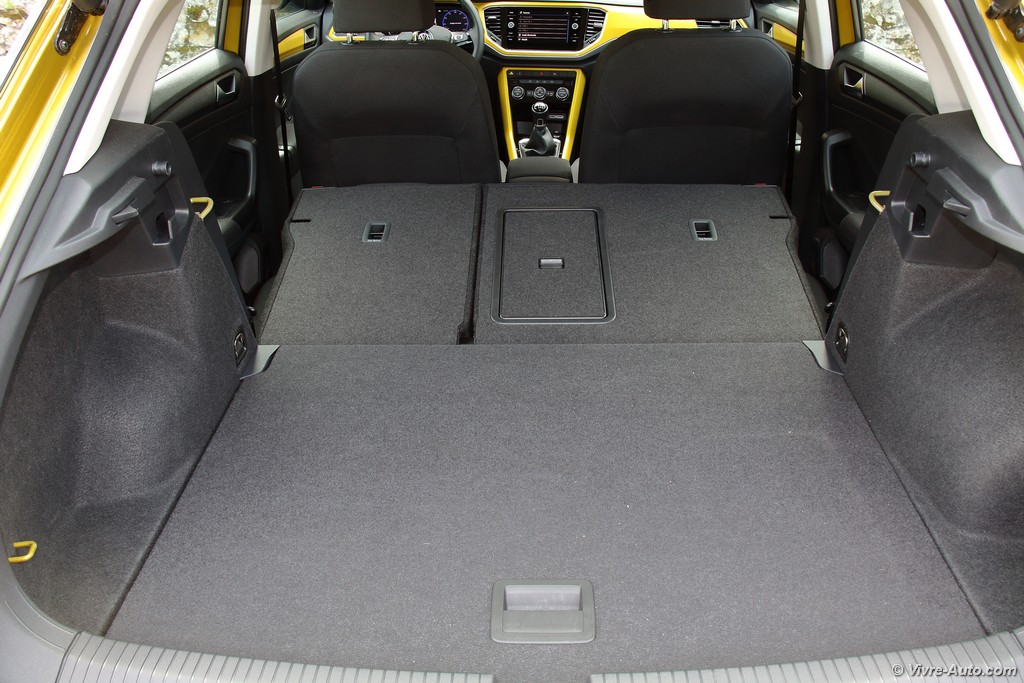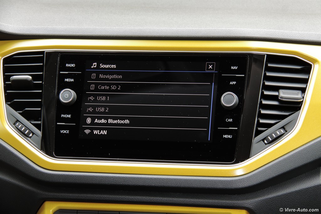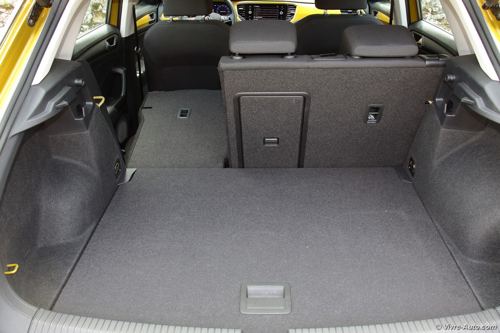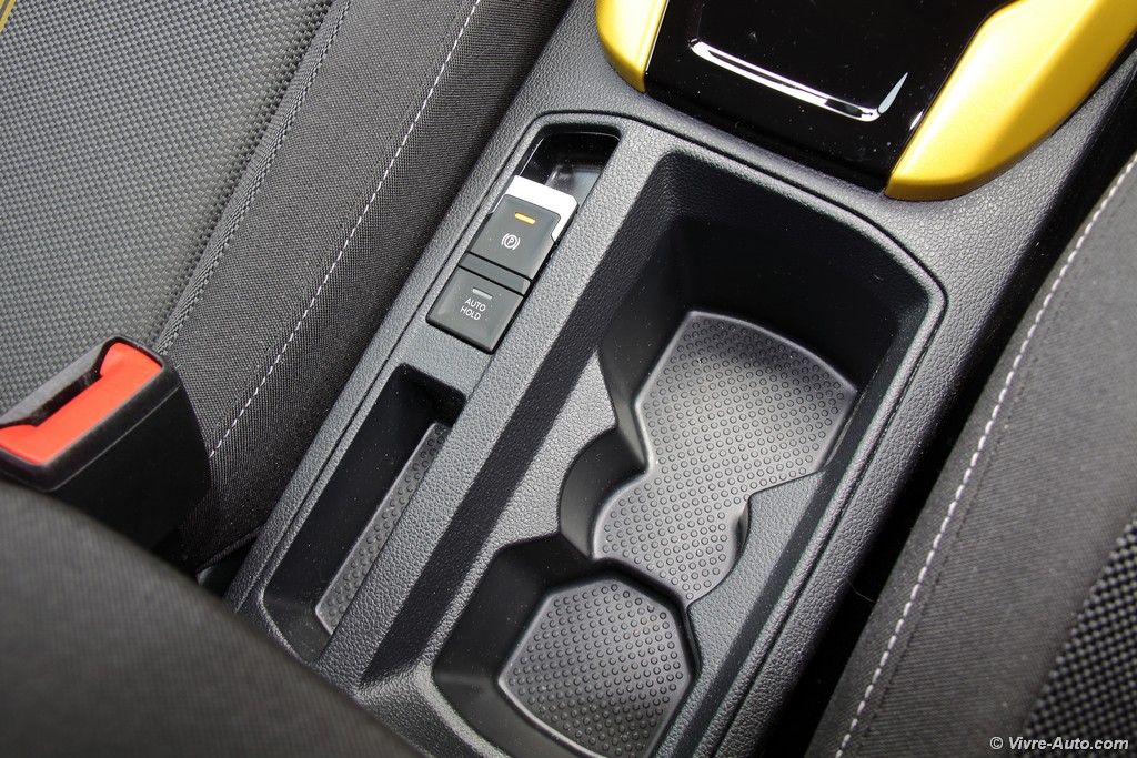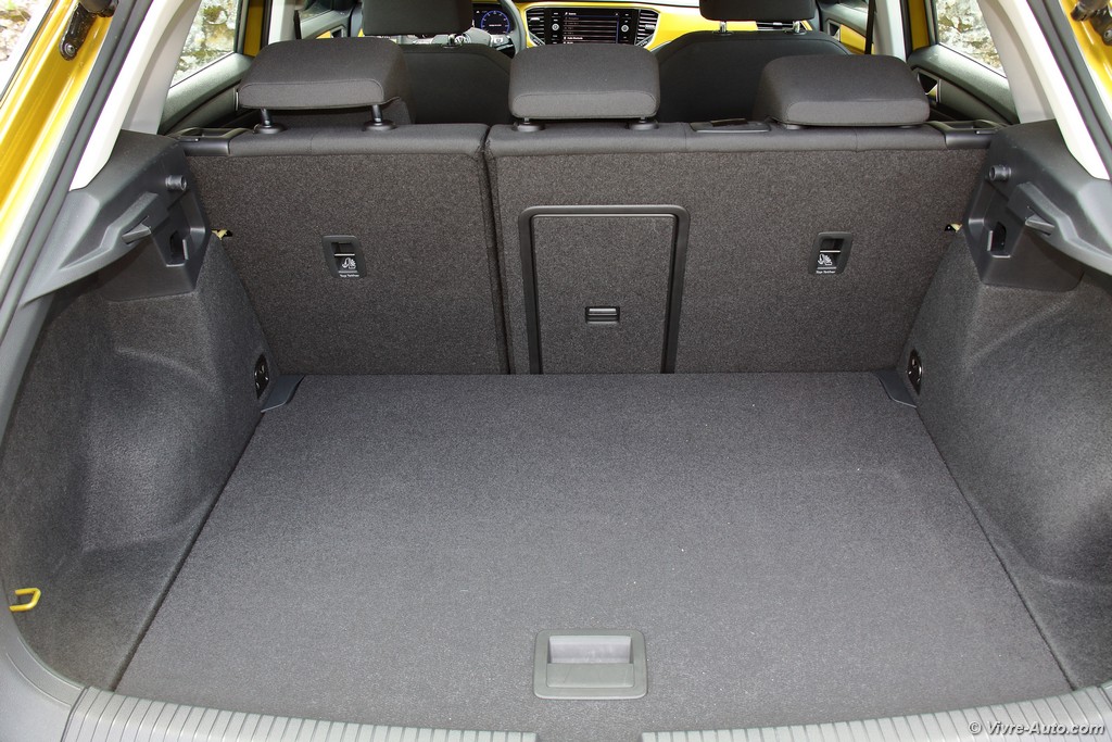 Heureusement, l’ergonomie sauve la mise. Le grand écran tactile central est un régal de réactivité. La navigation dans les menus, la gestion du Bluetooth ou la lecture des dossiers musicaux se font avec une fluidité exemplaire. En option, notre modèle profitait du combiné numérique (Active Info Display). C’est superbe, même si on regrette que la vitesse soit reléguée en bas à droite quand la carte de navigation occupe le centre. Côté pratique, le T-Roc assure : l’espace arrière est généreux pour deux adultes et le coffre de 445 litres est très bien conçu, avec un plancher modulable permettant d’obtenir une surface plane une fois les dossiers rabattus.