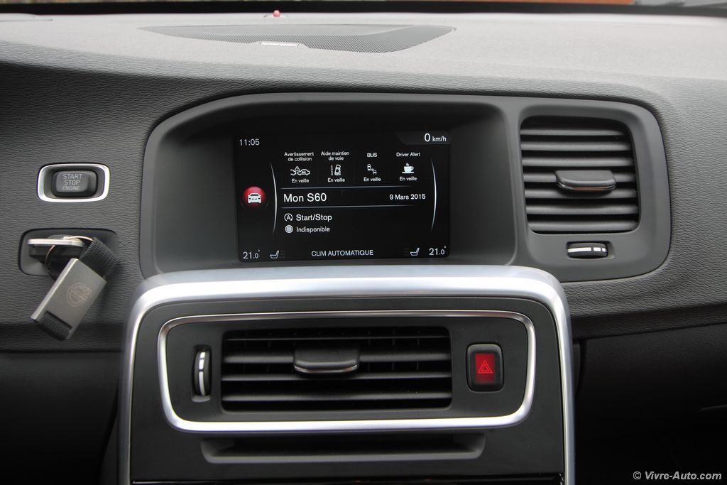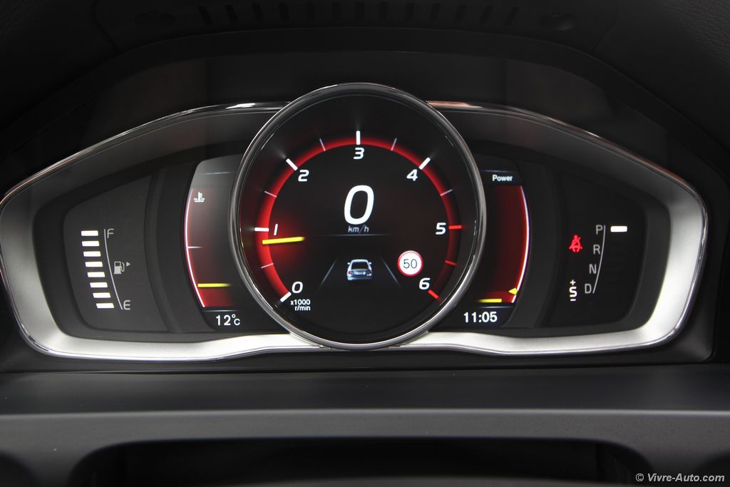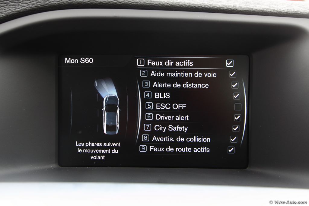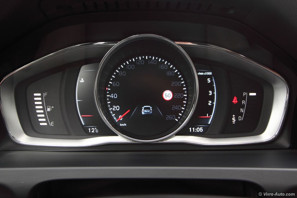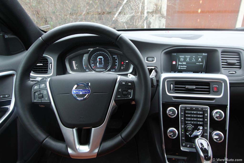 La présentation est très soignée avec des matériaux de haute qualité qui éveillent deux de nos sens, la vue et le toucher. Les sièges, plus enveloppants, sont très confortables, on trouve tout de suite sa position de conduite idéale, les appuis-têtes soutiennent parfaitement notre tête sans avoir besoin d’aller les chercher. Mention spéciale aussi pour le revêtement du volant qui se montre particulièrement flatteur au toucher. L’ensemble est raffiné et il n’y a nul doute que nous sommes assis dans un véhicule premium. L’ergonomie est bonne, malgré la multitude de boutons sur la console centrale, on n’est pas perdu car c’est bien étudié. Ce nouveau millésime ne se voit pas forcément au premier coup d’œil à l’intérieur. Mais en regardant de plus prêt on peut observer quelques modifications. A commencer par le rétroviseur sans encadrement, ça n’a l’air de rien mais visuellement c’est très réussi. De nouveaux boutons rotatifs sur la console ou encore le décor façon Piano black en noir laqué (option) présent sur notre modèle, attention toutefois aux rayures. Les compte-tours sont désormais numériques avec trois graphismes au choix, du rouge pour le dynamisme, de l’élégance ou un mode éco qui vous aident à adopter une conduite plus sobre. A l’usage, voyager à bord de cette S60 est un réel plaisir. En cette période, on apprécie le pare-brise, les sièges et le volant chauffant. Le système multimédia Sensus Connect et son écran de 7 pouces est très complet, il offre un lecteur DVD, le Bluetooth, les commandes vocales, une prise AUX et USB, 8 haut-parleur (180W) et le GPS. Ce dernier ne nous a pas posé de problème tout au long de l’essai, il est simple et clair. Sur autoroute il affiche les