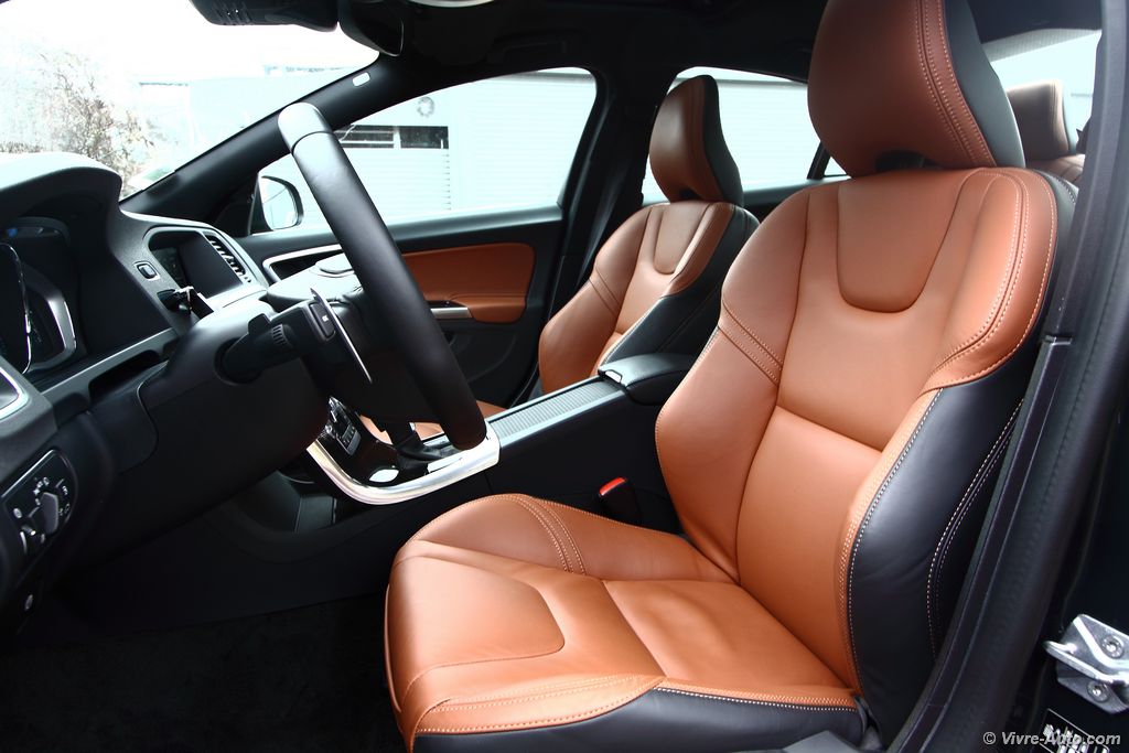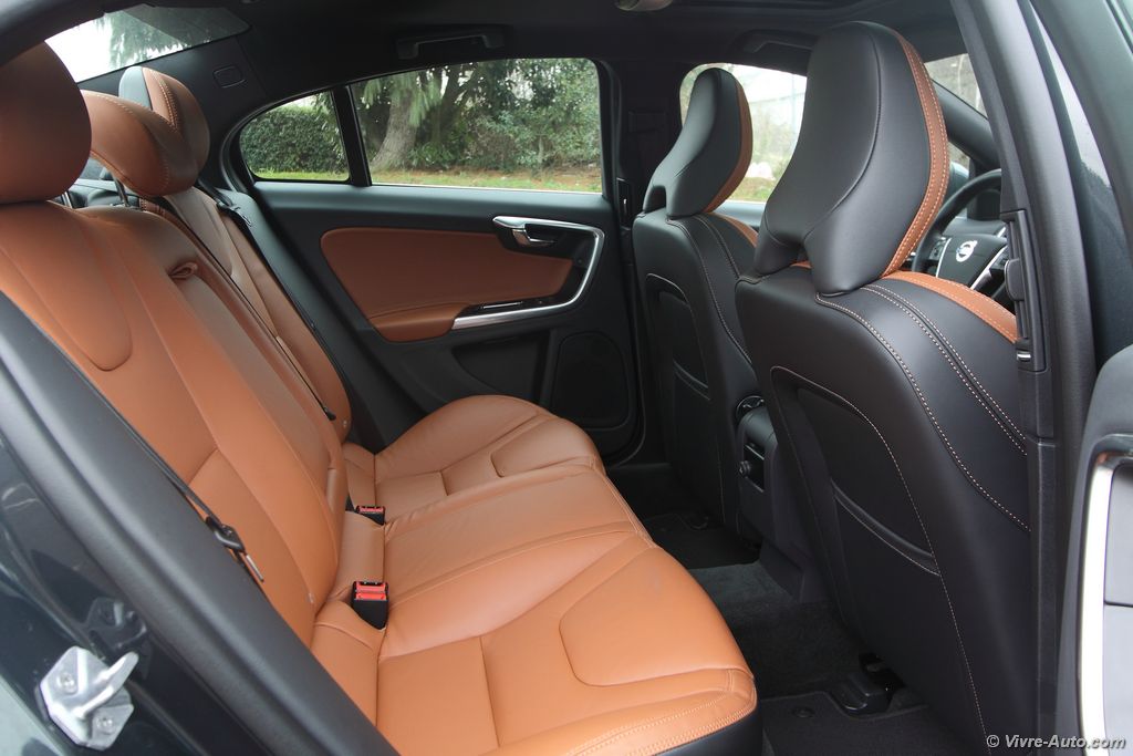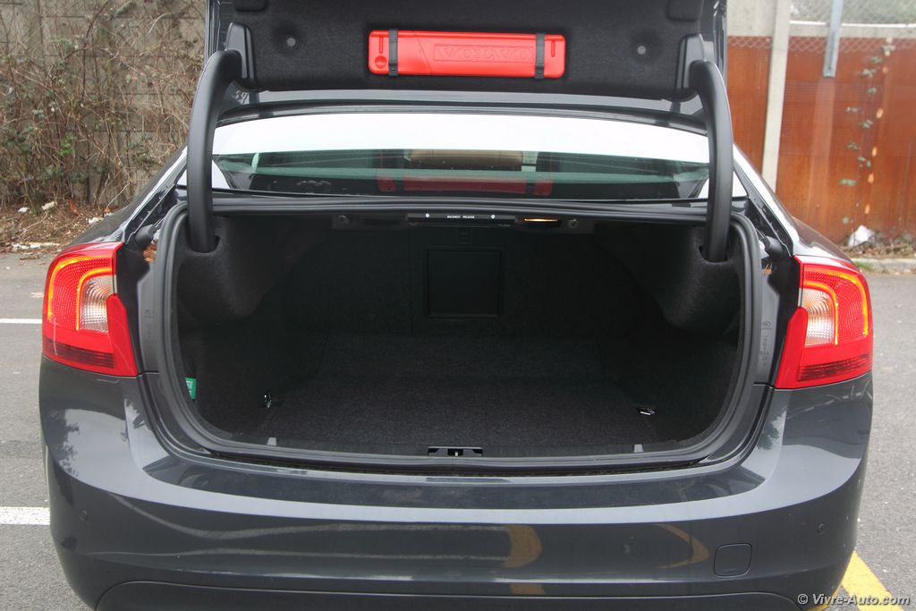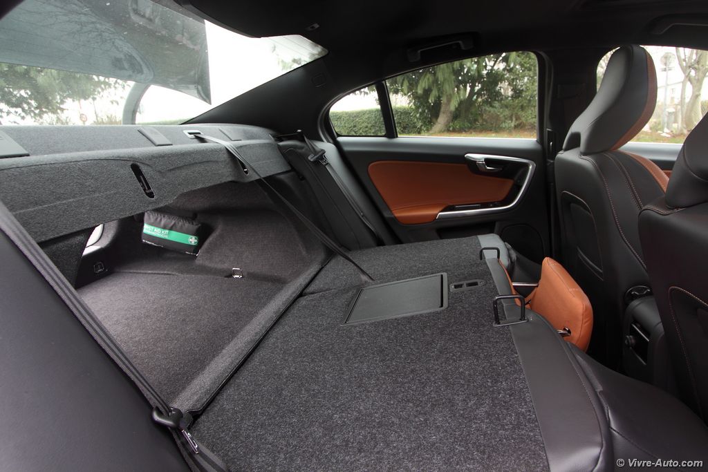 airs de repos avec leurs services, un détail que nous apprécions. De nuit les phares directionnels double Xénon sont très efficaces, nous avons remarqués que les rétroviseurs intérieur/extérieur passent en mode électrochrome sauf sur environ 5 mm de surface autour d’eux, c’est un peu déroutant au début mais on s’y fait. Mais le gros point faible de la S60, oui elle en a un, c’est son coffre. Ce n’est pas étonnant que la V60 se vende trois fois plus. La berline offre un volume de chargement de seulement 380 litres. Pas facile donc de charger des cartons d’ameublement suédois… Heureusement, pour 60€ le siège passager avant se rabat. On aurait aimé également que les poignées qui abaissent les sièges arrière soient un peu plus modernes. A l’arrière les passagers sont plutôt bien lotis à l’exception des grands gabarits, en cause, le toit fuyant.