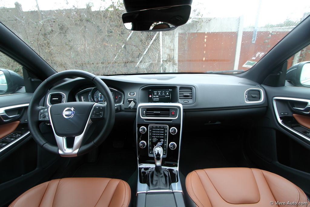 Mais avant de prendre la route faisons un petit tour du propriétaire. La S60, lancée en 2011 a été récemment reliftée. Cela concerne surtout la face avant qui se pare d’un nouveau dessin qui renforce la présence de la berline. Les designers ont élargi la calandre et modifié les blocs optiques. Le capot profite d’une nervure en V plus marquée, des feux de jour à LED ont été ajoutés et une lame vient souligner le bouclier. La partie arrière reçoit deux sorties d’échappements rectangulaires sur les versions D4 et D5. Le catalogue est assez riche en personnalisations avec pas moins de quatorze teintes de carrosserie et des dizaines de jantes au choix. Sans oublier la finition à connotation sportive R-Design. Globalement cette nouvelle S60 aux allures de berline-coupé avec sa ligne de toit fuyante, dégage un peu plus de caractère que le modèle précédent. Pour notre part on aime.