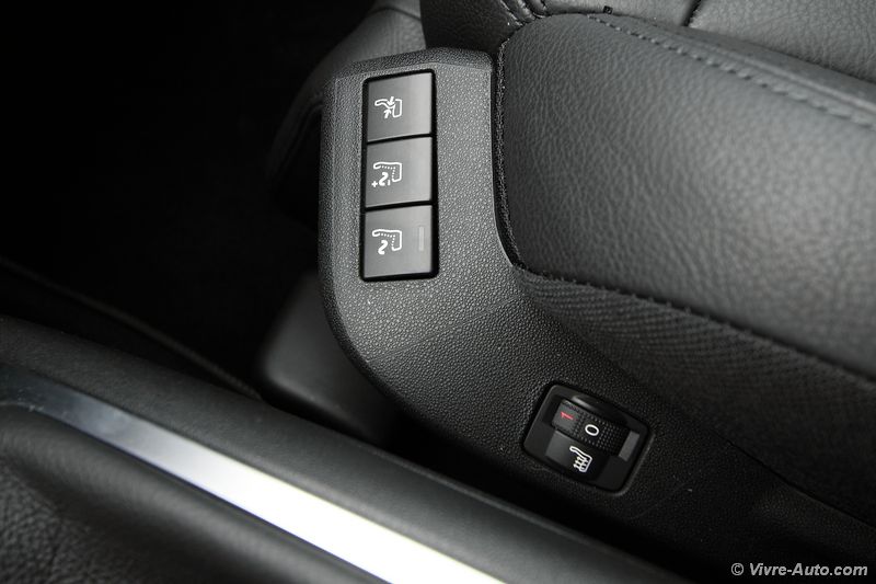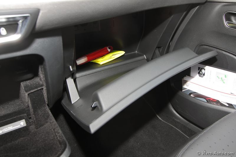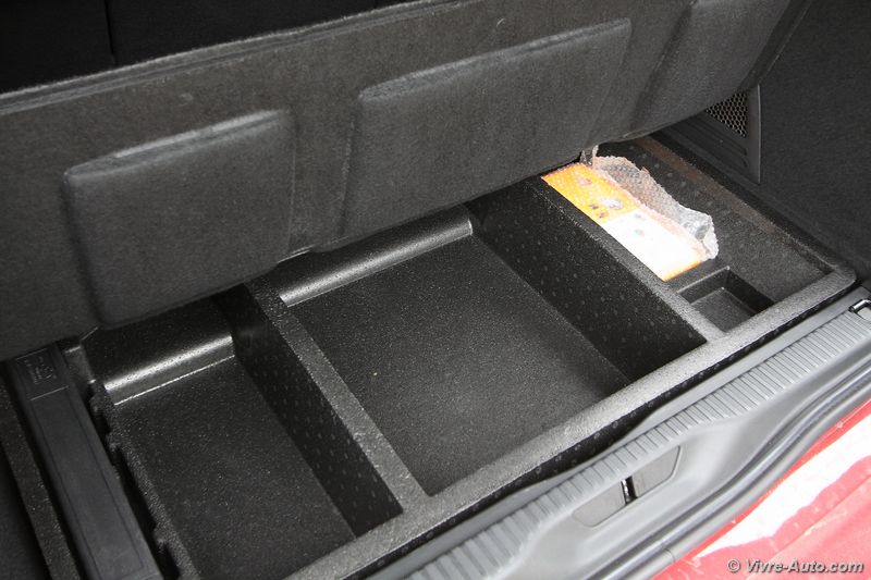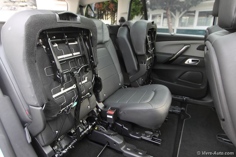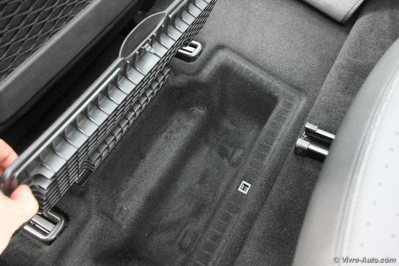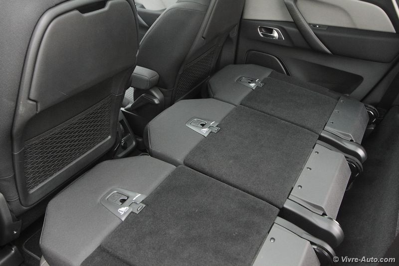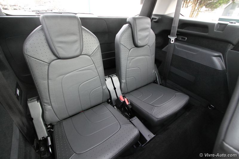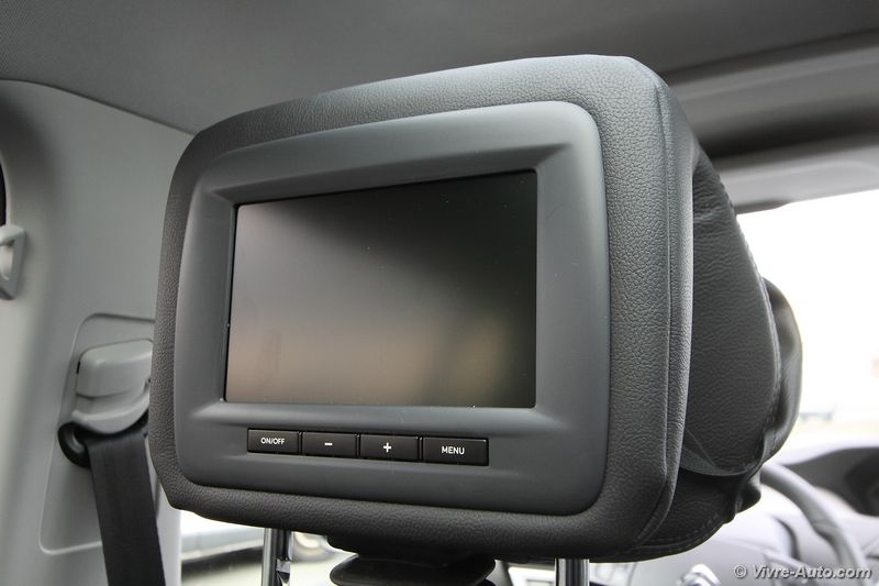 Mais passons à l’arrière, la deuxième rangée offre des sièges tous de même largeur et coulissant avec dossier inclinable. L’espace aux jambes est bons mais un adulte de plus de 1,80 mètre touchera le toit. Petit détail pratique, les tablettes des dossiers des sièges avant sont maintenant éclairés. Un pack multimédia propose une prise 230V, un lecteur DVD, la Hifi JBL et le système multimédia Plug&Play avec deux écrans dans les appuies-tête. Côté habitabilité donc, c’est toujours aussi appréciable. Les rangements sont également de la partie avec pas moins de 16 endroits différents, mention spéciale pour le rangement centrale au bas de la console qui, une fois ouvert permet de poser son téléphone et de l’alimenter via les différents connecteurs.
