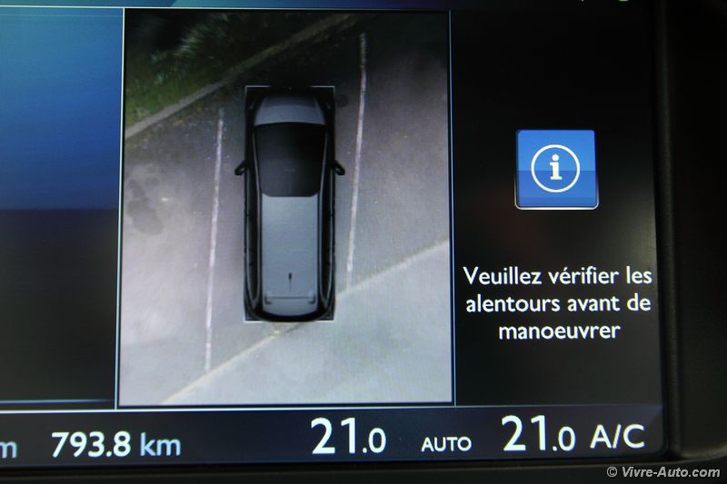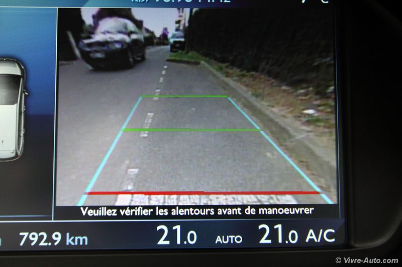premier de 12 pouces situé dans la partie haute affiche les informations de conduite, la partie gauche reste fixe avec la vitesse, et à droite au choix, le cadran de compte tours, la consommation de carburant, la navigation ou encore une photo, le tout proposé en trois thèmes différents. Le deuxième écran de 7 pouces est tactile et sert d’interface de commande avec six fonctions principales, la climatisation, les aides à la conduite, le système audio, la navigation, le module internet, et la téléphonie. Tout est ainsi regroupé et peut perturber au début mais une fois habitué on s’aperçoit que c’est extrêmement pratique. L’ergonomie de la planche de bord est une vrai réussite et facilite la vie au quotidien. Ce n’est pas le cas des commandes au volant, pas moins de 12 touches et 4 molettes permettent de piloter le système audio, le régulateur de vitesse, le Bluetooth, l’ordinateur de bord, l’aide de parking, le mode nuit… On en est même à presque regretter les anciens commodos de PSA sous le volant. Autre changement, celui de la position du levier de vitesse. Dorénavant situé au bas de la console centrale, il ne fait plus partie de la planche de bord et son utilisation se montre ainsi plus confortable. La qualité de finition a été revue à la hausse avec des matériaux très valorisant. Mais là où la marque aux chevrons va encore plus loin c’est avec les nombreux équipements du catalogue !